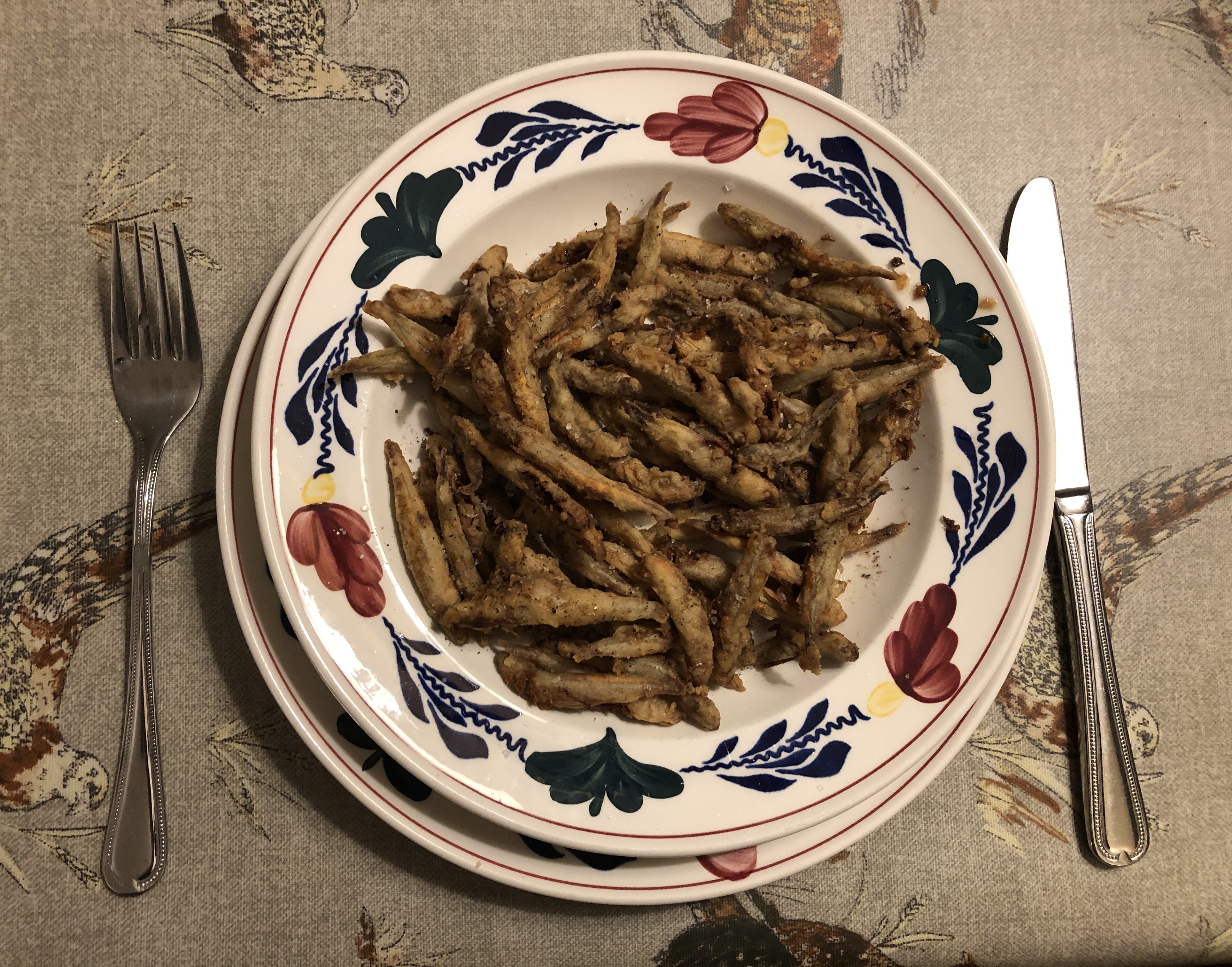 Ooit leerde ik in Frankrijk ‘friture de mer’ eten; net als patat gebakken kleine visjes: spiering, die ze daar eparlan noemen. Grote spiering kende ik al, als kind kochten we die op zaterdagochtend op de markt. Héérlijk. En die kleintjes hebben we inmiddels ook in Nederland gevonden, gewoon ingevroren bij de groothandel. Het is voedsel als genotmiddel.
