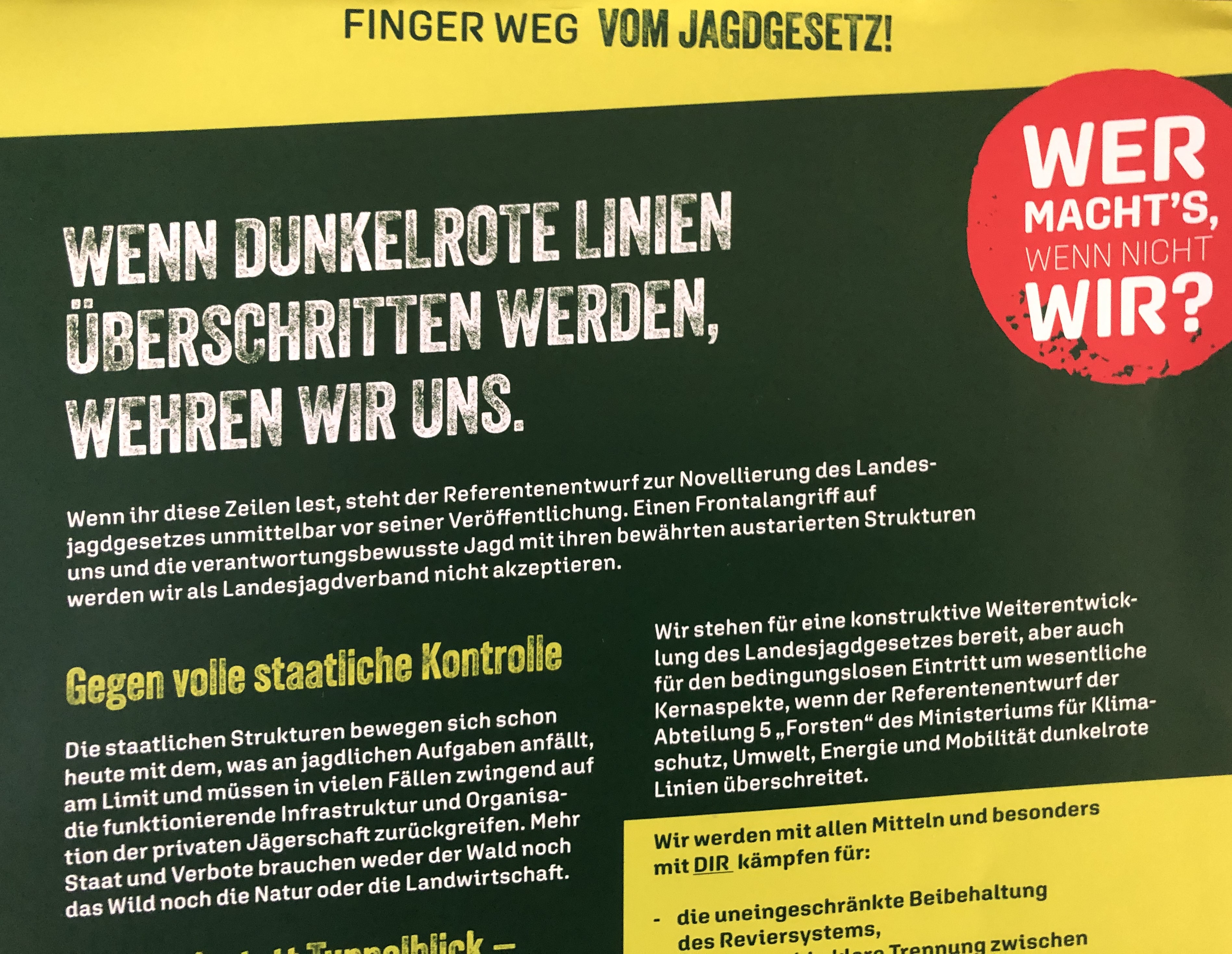 Het is slechts één van de dingen die jagers doen en het motto in deze fase van het verzet tegen de voorgenomen wetswijzigingen daar is dan ook ”Wer macht’s wenn nicht wir?”