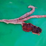Door de darmwand heen zijn lichtkleurige ophopingen te zien
