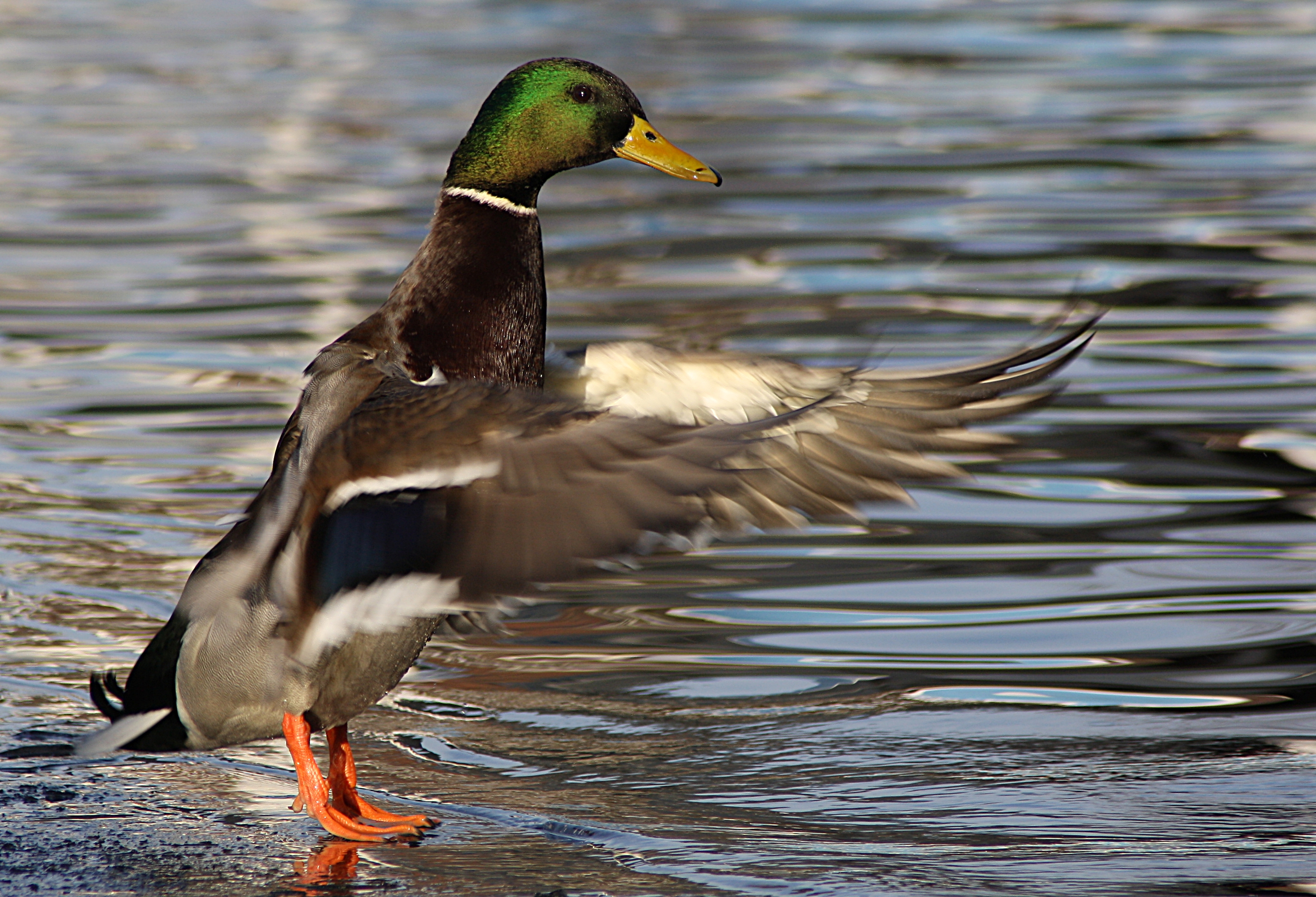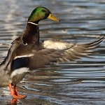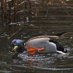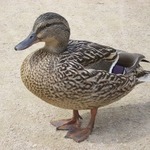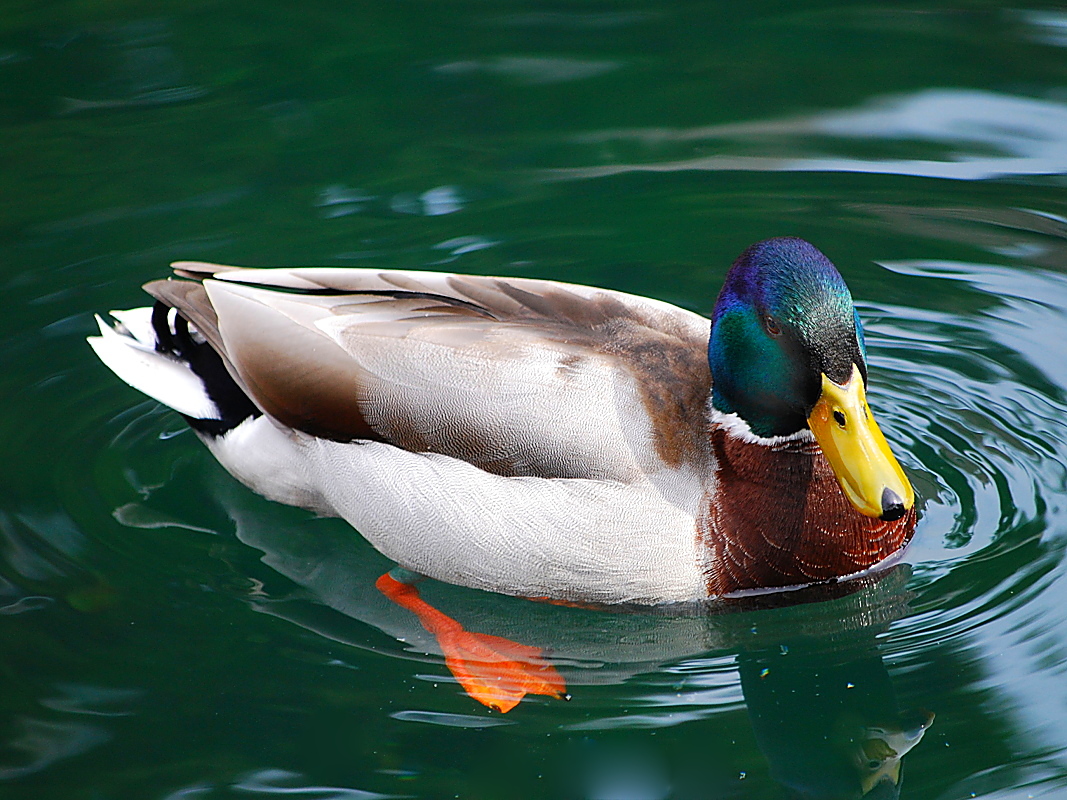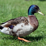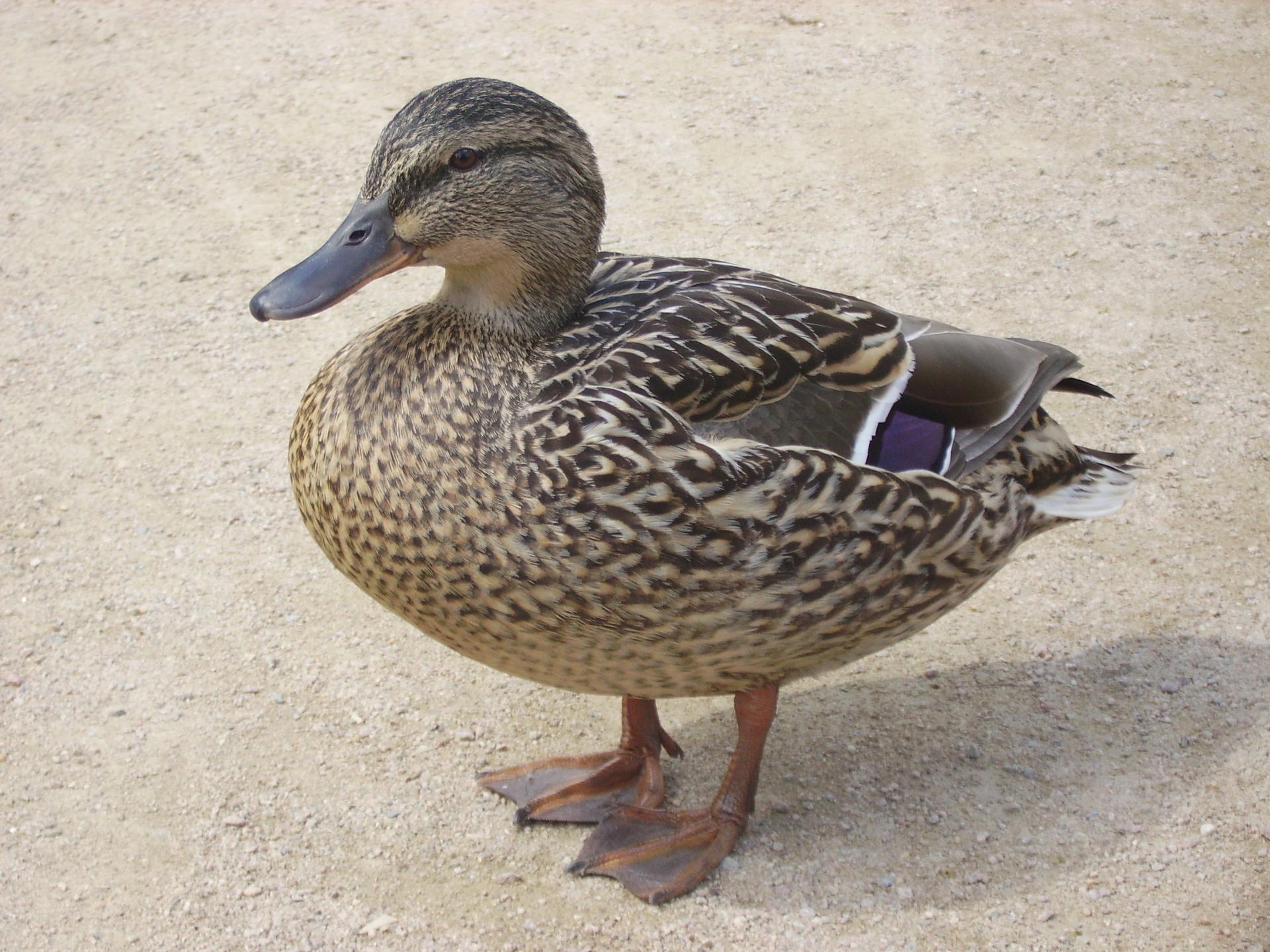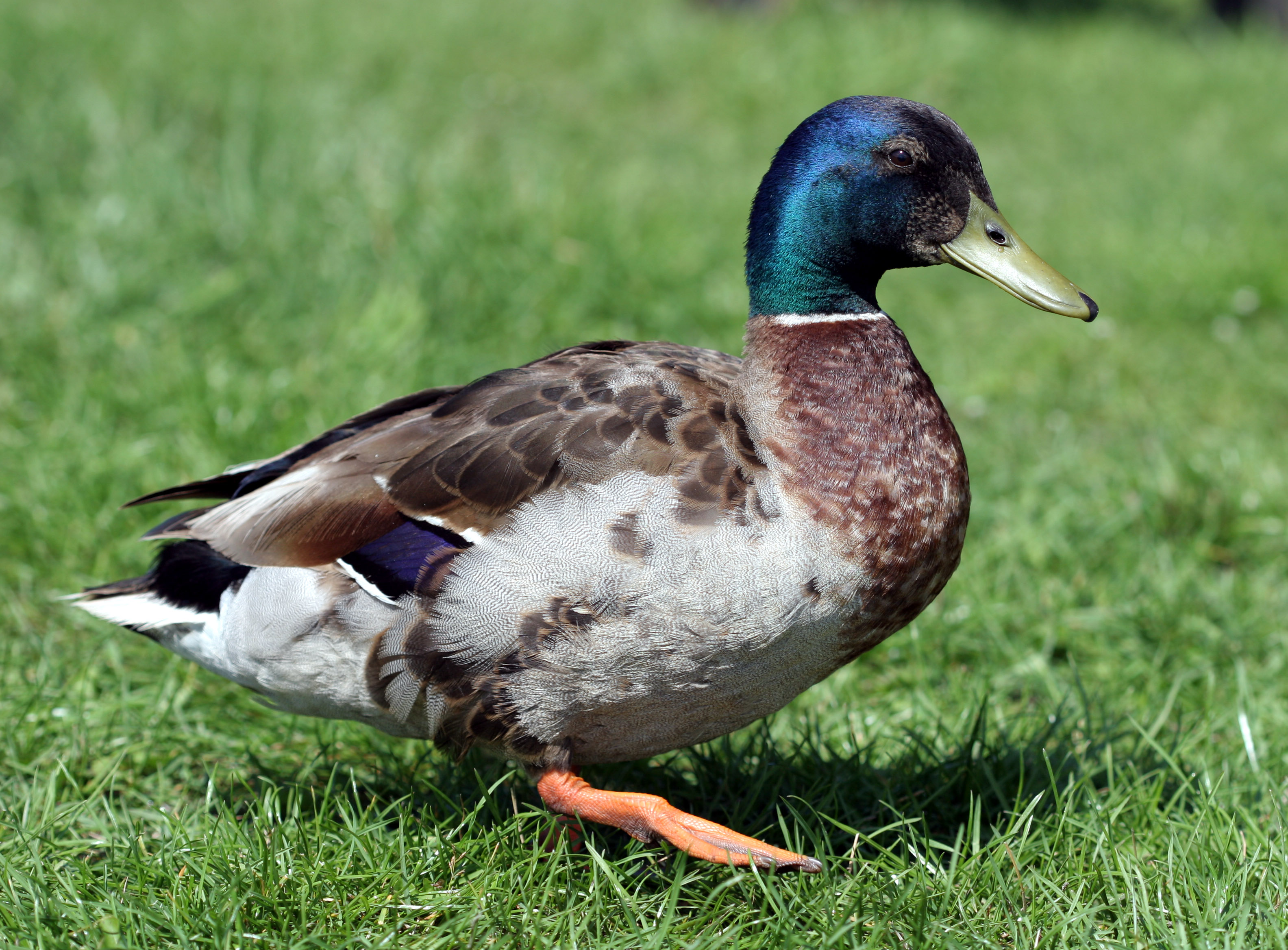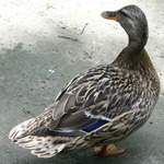 - De wilde eend heeft oranje poten en een paarsblauwe vleugelspiegen met twee witte zomen