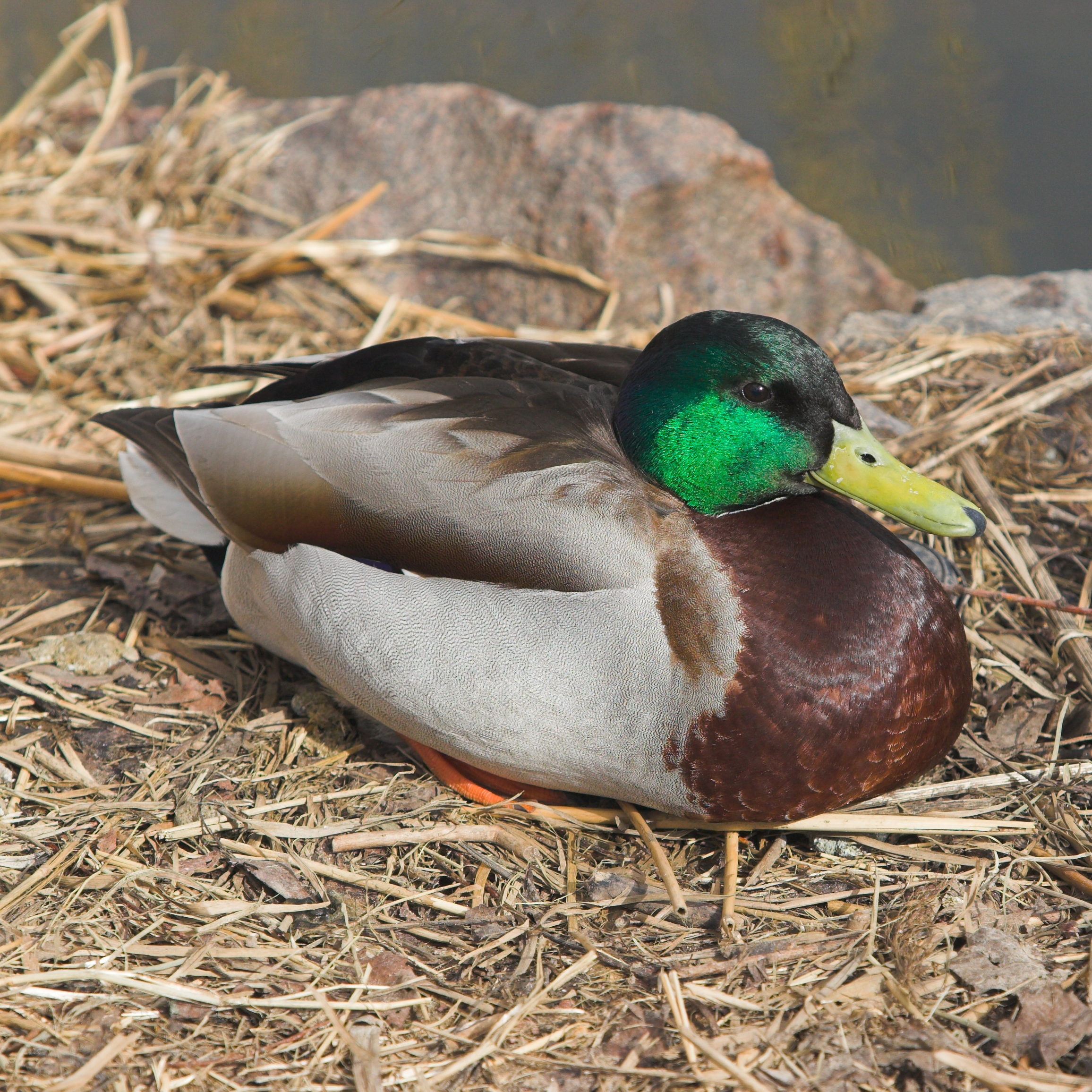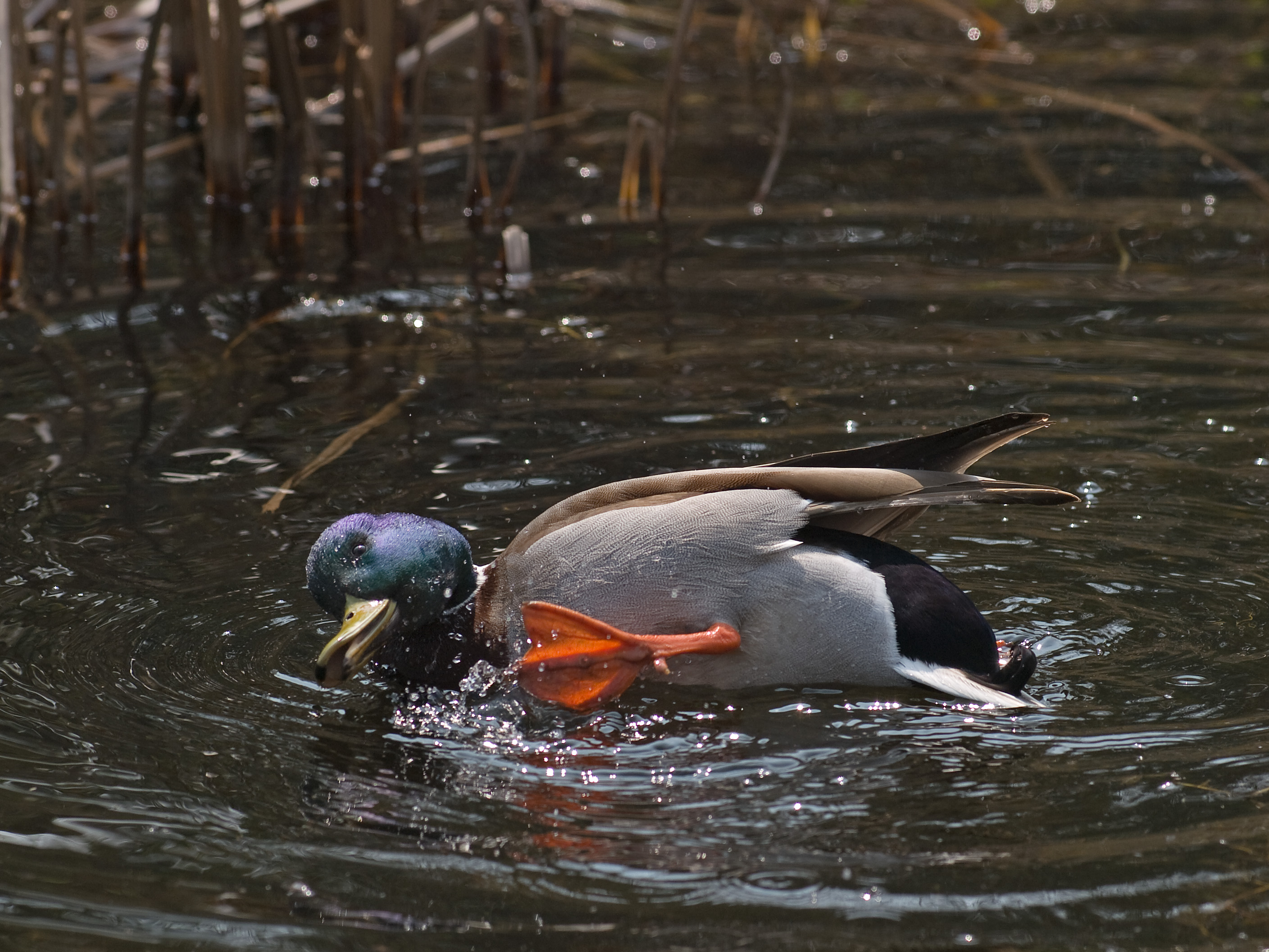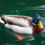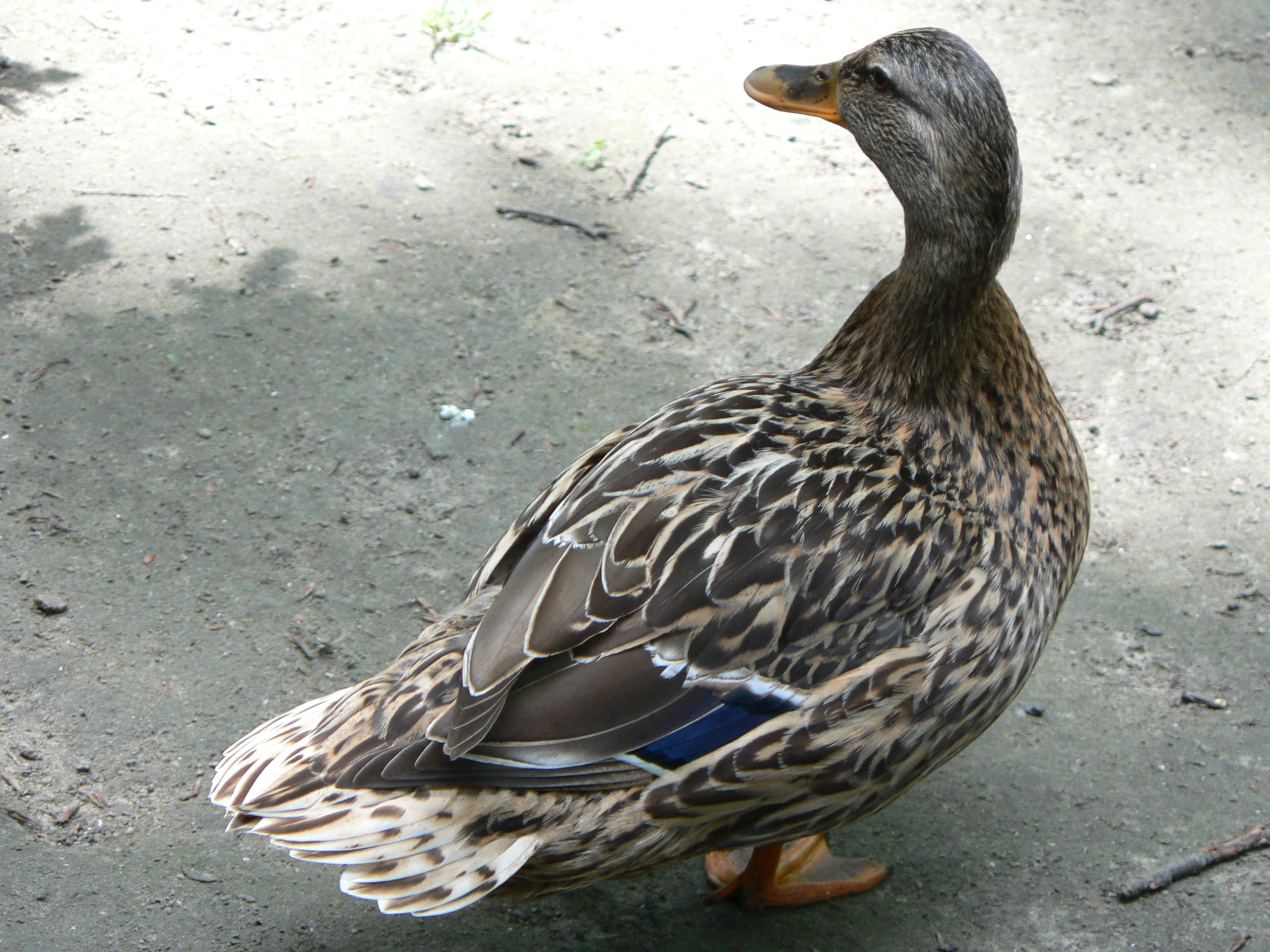 - De wilde eend heeft oranje poten en een paarsblauwe vleugelspiegen met twee witte zomen