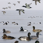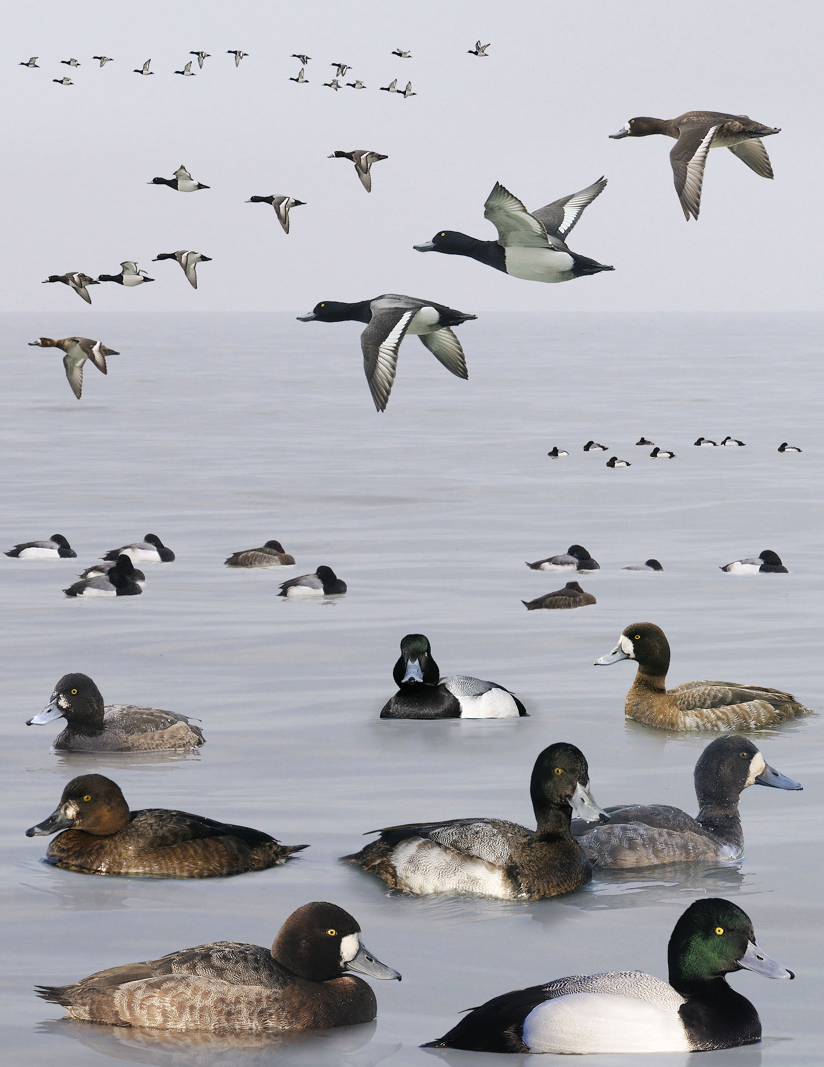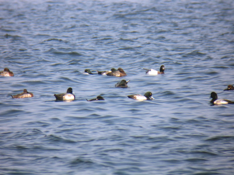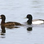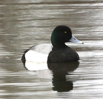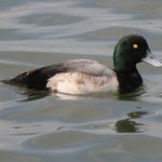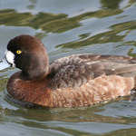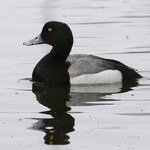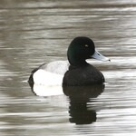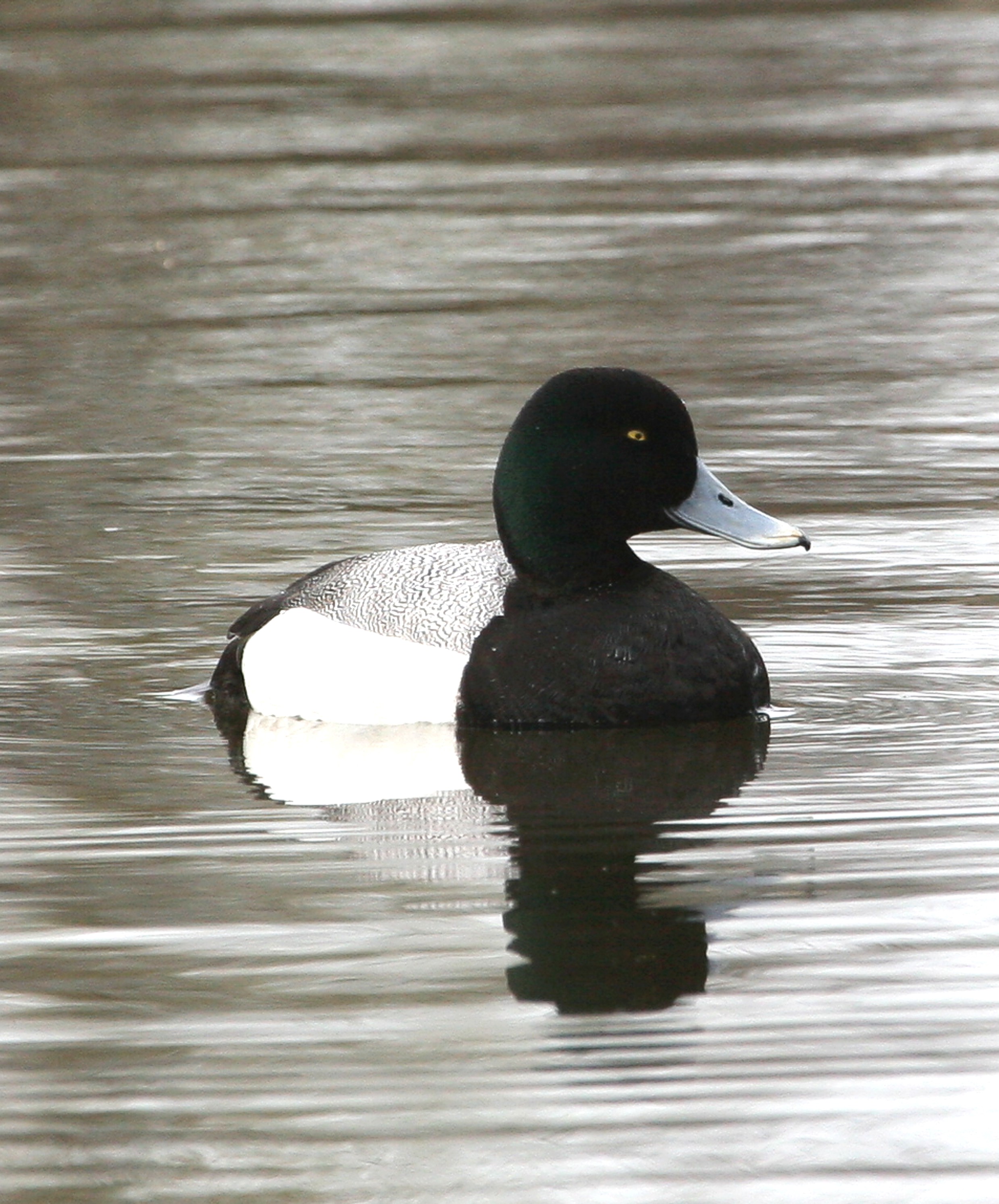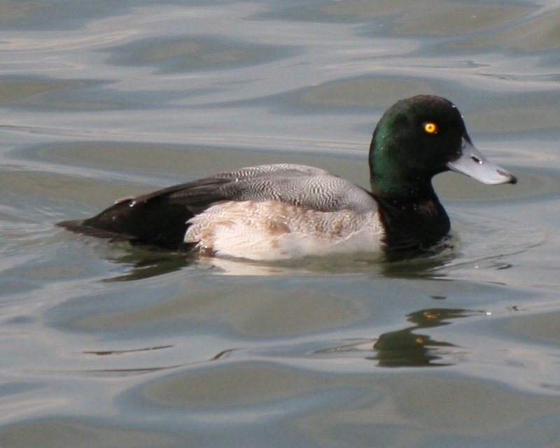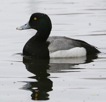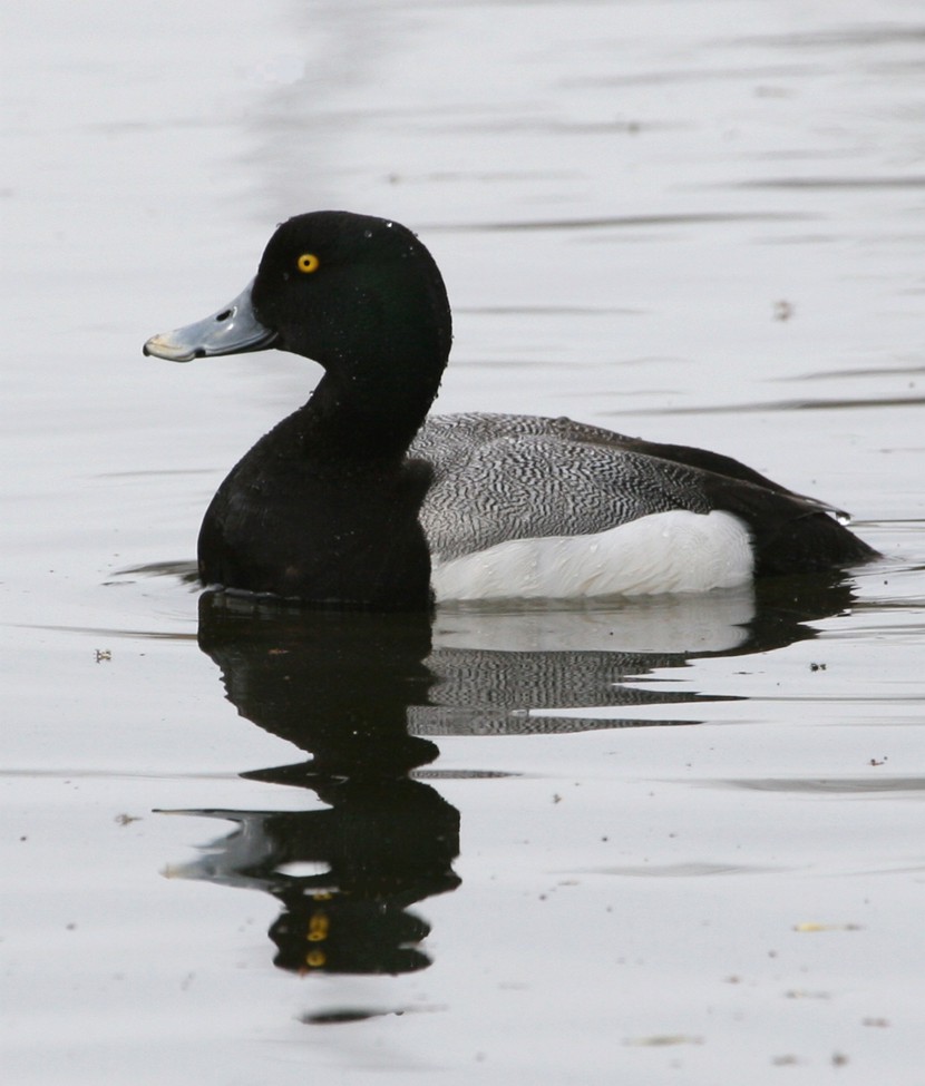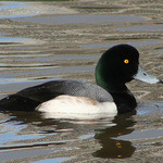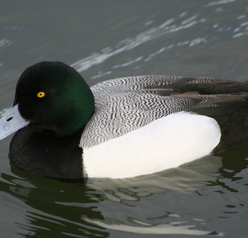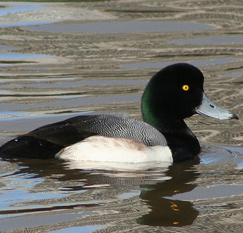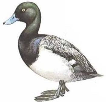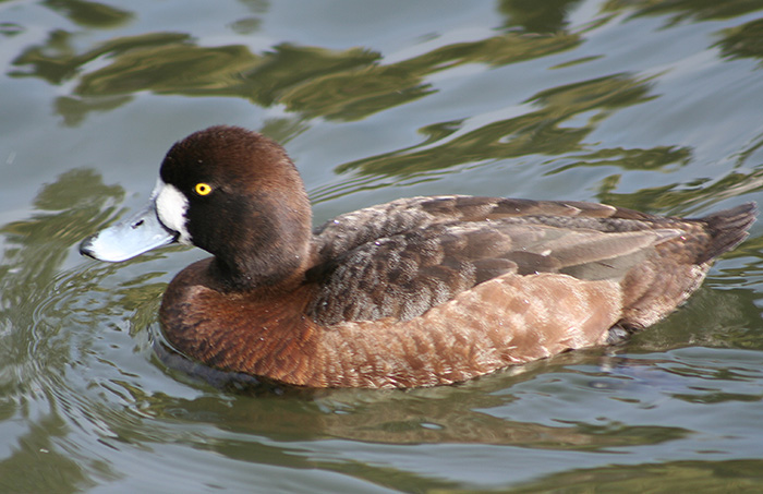 Het eendje heeft een grote witte vlek rond de snavelbasis