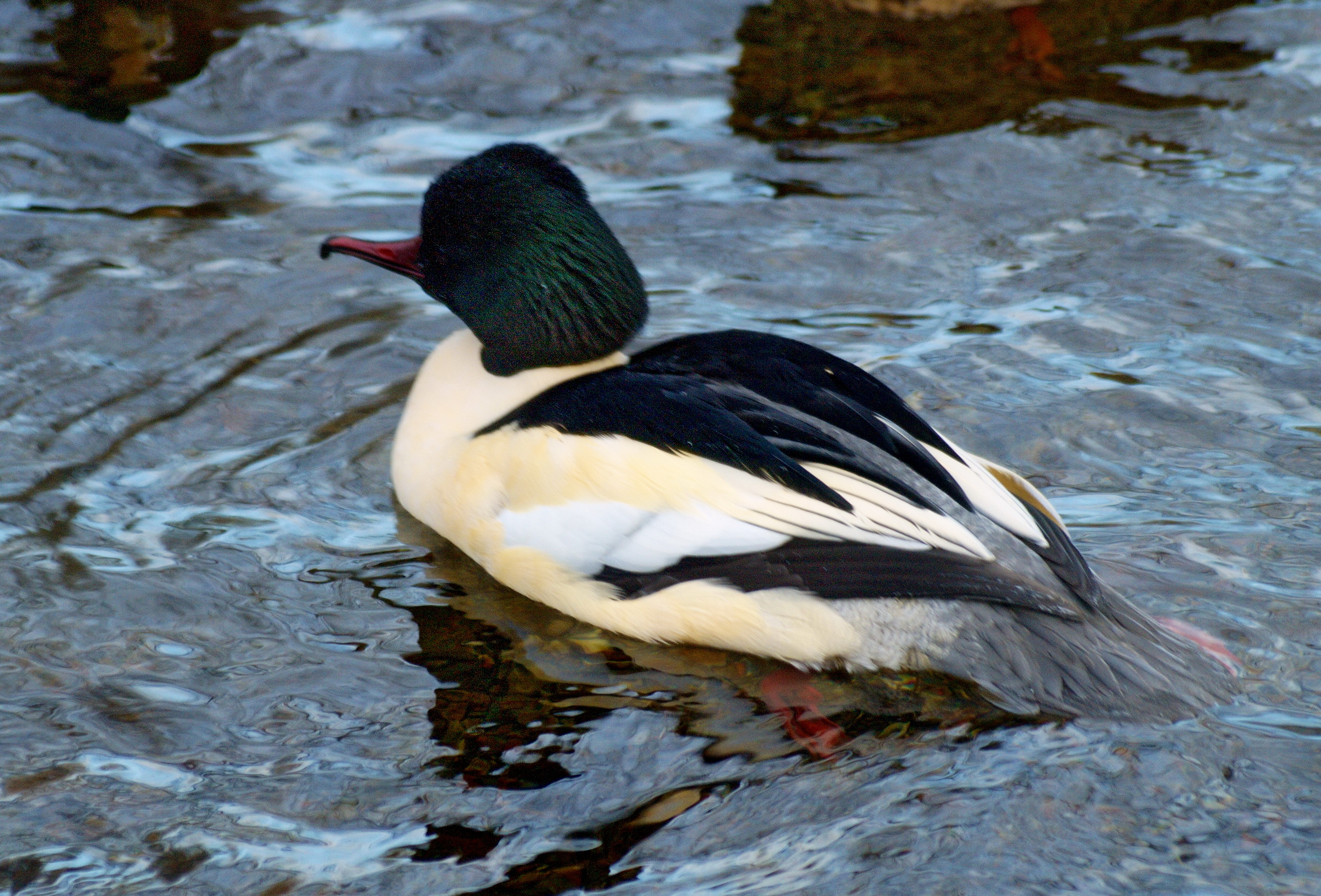 De woerd heeft een wit lichaam met een donkergroene rug en kop
