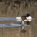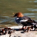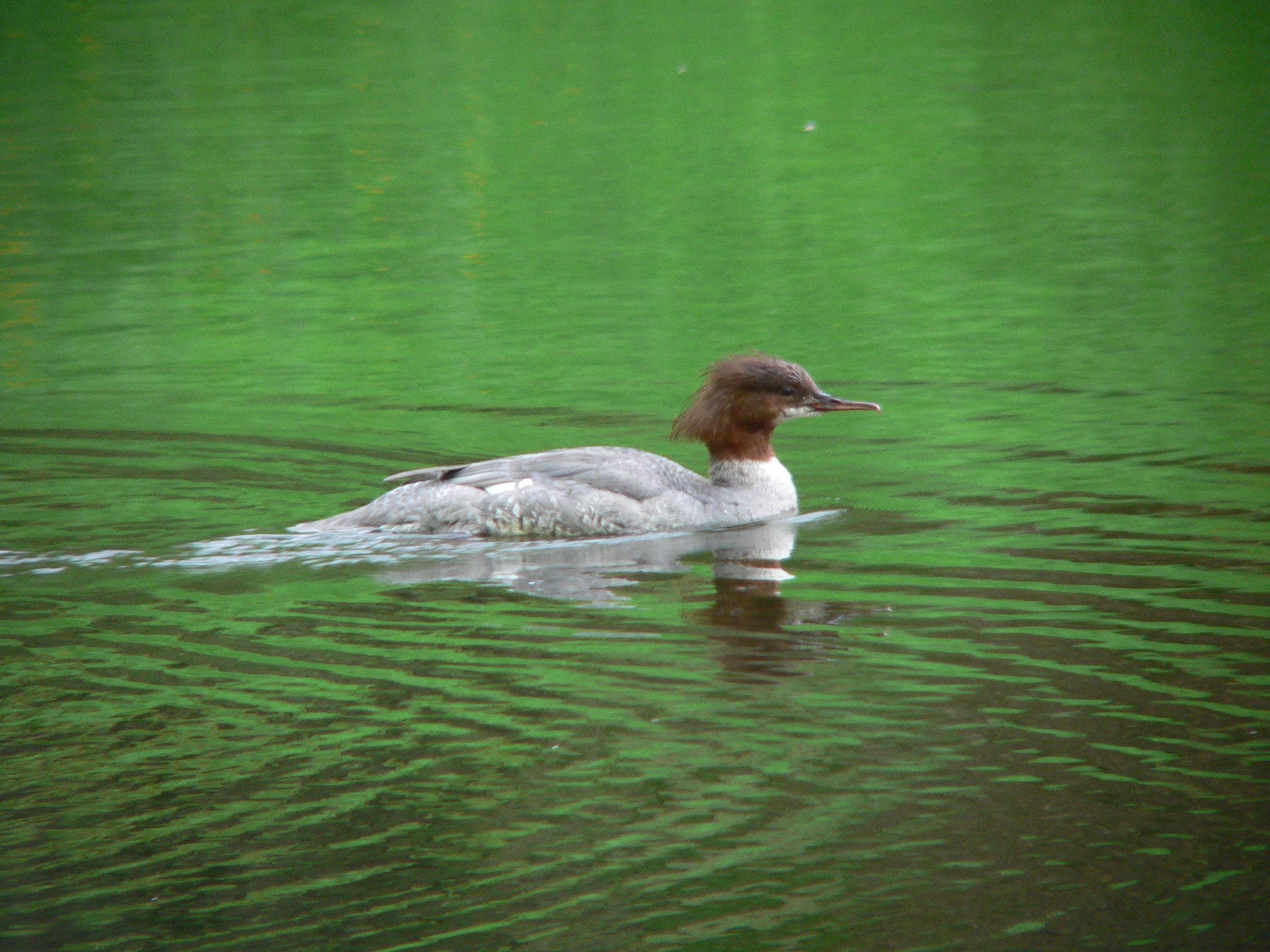 Het eendje heeft een bruine kop met kuif