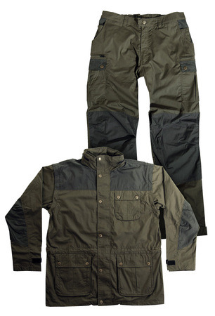 Licht zomer pak. Bovenstof van katoen gemengd met een aandeel polyester. Het doek heeft een wax-finish. Deze finish maak het doek water- en vuilwerend. De jas is volledig gevoerd met een polyester netvoering. De jas heeft de ruime zakken van buiten en afsluitbare binnenzakken en een Handy-zakje. Een capuchon kan opgeborgen worden in de kraag. Om van de jas een vest te maken zijn de mouwen afritsbaar. De rug is open verwerkt zodat de jas uitstekend ademend is. Op verschillende plaatsen is gebruik gemaakt van dubbel kontrast stof. De broek heeft een comfortable elastische verwerking. Knieën en kont zijn van dubbel kontrast stof. De broek heeft extra veel zakken en is vanonder verstelbaar.
