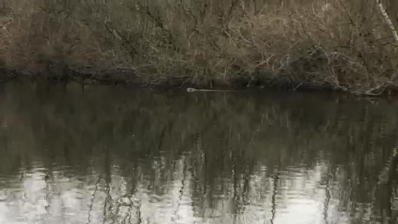 De aalscholver duikt onder en komt een tiental meters verder weer boven. Nog steeds die paling om zijn nek. Nu hij weg is van de hond neemt hij de tijd om korte metten met de paling te maken. Het duurt even, maar uiteindelijk verdwijnt de vis, schrokkend werkt de aalscholver hem naar binnen.