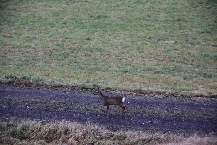 Het ree loopt inmiddels op het pad dat voor hun kansel langsloopt. Dan staat ze stil, ik vermoed dat ze zekert. En dat kan kloppen, want opeens springt ze af.