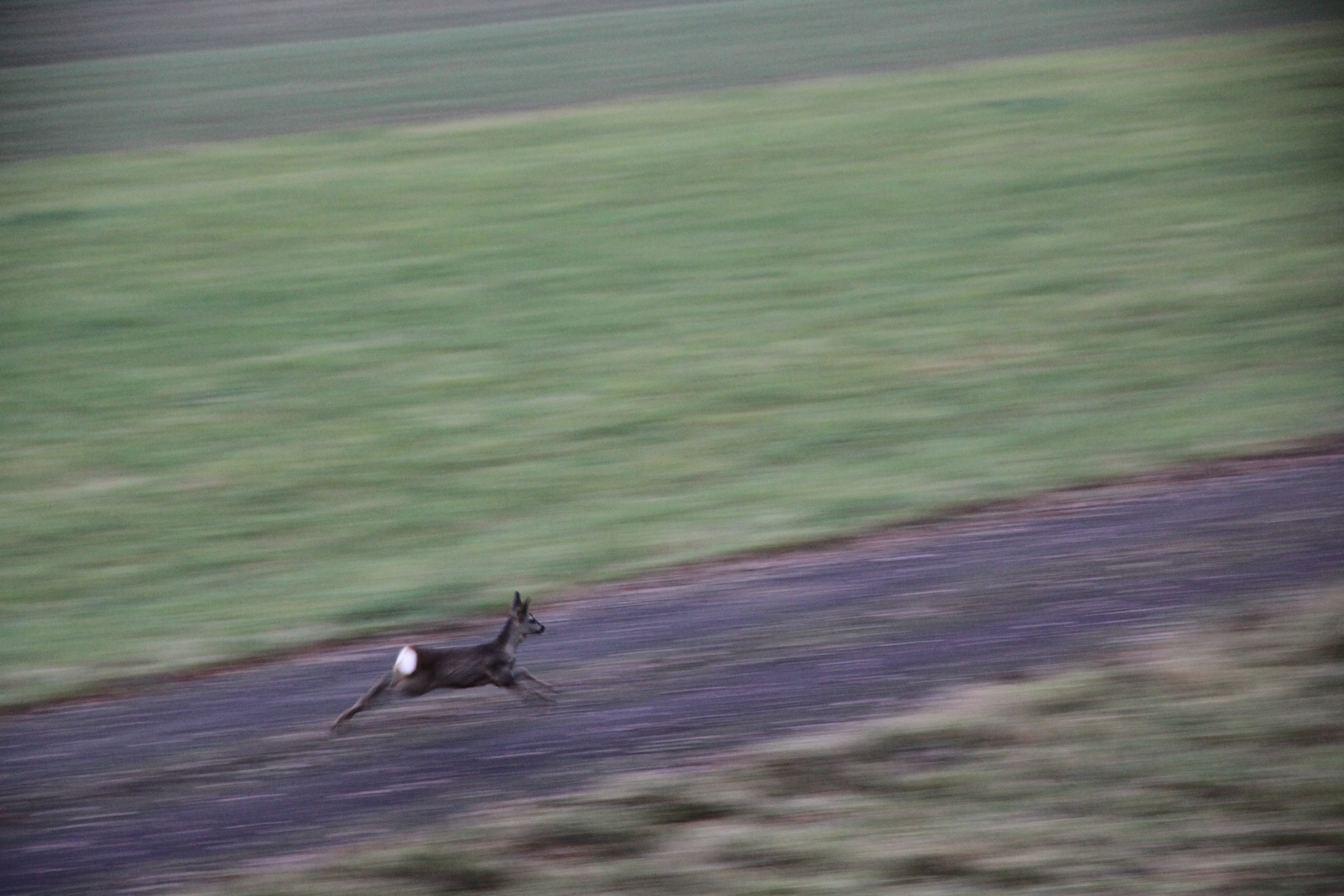 Dan opeens, net als ik na bijna twee uur denk dat het vanavond een “Ansitz Ohne’ lijkt te worden, komt er zo’n 150 meter voor mij een ree op de lopers.