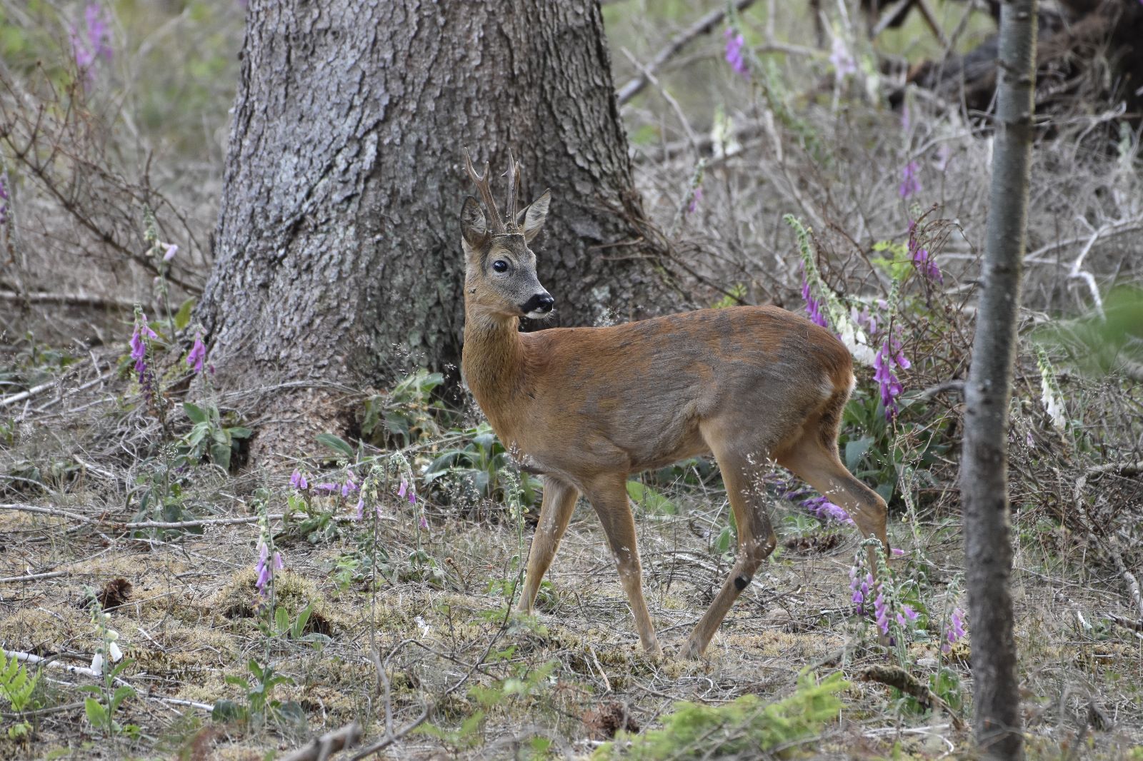 Langzaam, heel langzaam verplaatst de bok zich wat. Ik kan hem nu goed aanspreken. Het is een gaffel, jaarling? Gelukkig niet de ‘te schonen bok’ schiet door mijn hoofd. Stel je voor.
