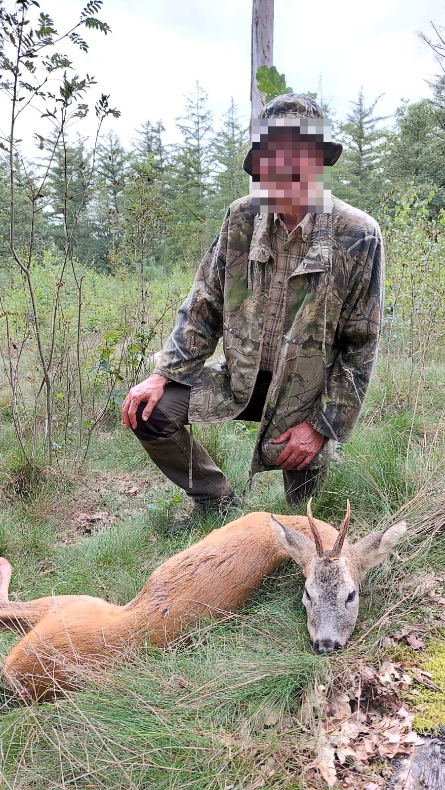 Samen dragen we de bok richting het laddertje, daar pak ik mijn mes om met het rode werk te beginnen. ‘Wacht, zegt T., en hij loopt naar een jonge eik voor een breuk. Met een ferme handdruk en ontbloot hoofd overhandigt hij die mij. ‘Weidmansheil, je hebt er lang op moeten wachten maar, zoals altijd, de aanhouder wint’.