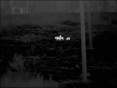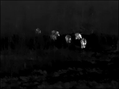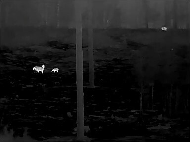 Het is rustig, erg rustig. Tijd genoeg om fluisterend wat te kletsen en onze warmtebeeldkijkers te vergelijken. De Lahoux van R. is duurder dan de Flir van mij en het resultaat is er ook naar, veel scherper en duidelijker. De zijne heeft ook nog de mogelijkheid om het beeld dichterbij te halen. “Ik kan zelfs de enden van het gewei van herten tellen”, zegt R. Ik vind het prachtig, maar die paar duizend euro meer voor een apparaat als de zijne, zijn mij toch te dol. Ik kan met de mijne prima de omgeving scannen en als ze op redelijke afstand zijn is ook prima te zien om wat voor wild het gaat. Gewei-enden kan ik niet tellen, maar roodwild wordt toch niet in het donker geschoten, dus besteed ik mijn euro’s vooralsnog maar aan andere zaken. “O, ja, ik kan ook nog opnames met de camera maken, die dan kunnen worden doorgezet naar je iPhone, maar daar ben ik nog niet zo handig in, dat ga ik weer eens even proberen”, vervolgt R.