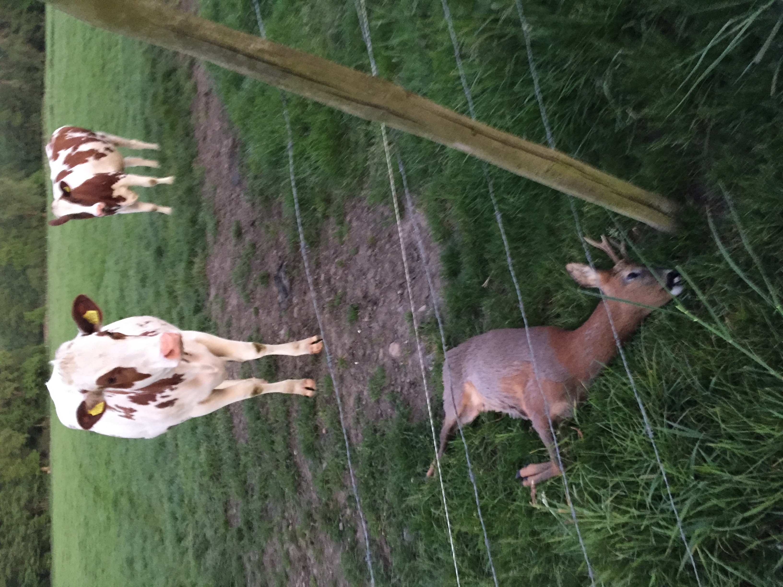Ik voel watervallen achter mijn ogen. Hooikoorts inclusief niesdrang. Dat kan ik nu niet gebruiken. De wind staat goed voor deze aanzitladder. Daar staat een feloranje geit met haar grote jong van vorig jaar! Ze likken de laatste restjes winterhaar uit elkaars vacht. Aandoenlijk en mooi tafereel. Daar doe ik het bv voor. Van links huppelen twee bokken de wei op. Een gaffel en een spitser. De gaffel laat meteen zien wie hier de lakens uitdeelt. De spitser doet zijn naam eer aan en huppelt spits weg, zijn spiegel naar mij gekeerd. De gaffel dwarst en valt op dat moment om. De Mauser heeft gesproken. Ik blijf kijken door de kijker en zie hem roerloos liggen. 15 minuten volharden. Het kan een krelschot zijn, maar ik denk dat ik goed ben afgekomen. De geit en haar kitz en de spitser blijven gespannen staan. Zekerend de lucht opsnuivend. Ik grendel voor alle zekerheid nog eens. Maar het gaffelbokje blijft liggen. Pfff. Geen vangschot nodig. Ik laat de gelukzaligheid binnenstromen. Anders kan ik dit gevoel niet definiëren.