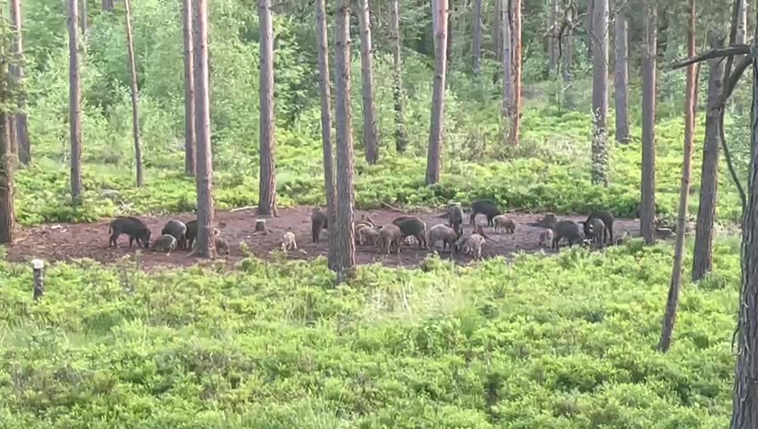 Hij is zo druk met die app in de weer, dat hij nauwelijks nog oplet. Hij ziet dan ook niet de biggen die als vanuit het niets op de voerplek komen. Direct erna gevolgd door vier zeugen en drie overlopers.