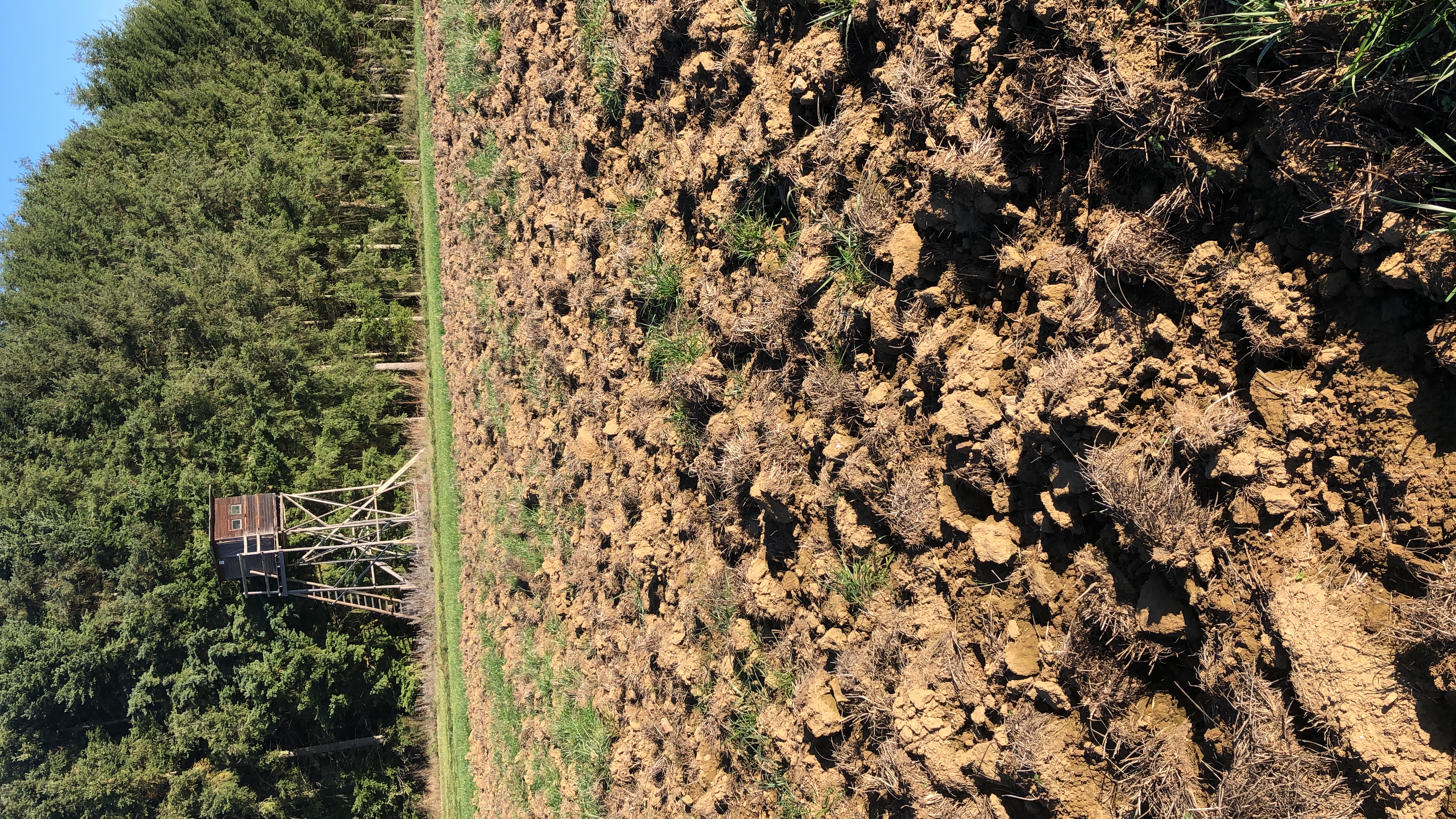 Als we door de ingevallen duisternis niet meer kunnen aanspreken lopen we naar de E.-kansel. Daar hopen we nog een kans te hebben op varkens die via de akker daar van het ene bos naar het andere oversteken. De jachtopzichter had op de weg daar regelmatig de moddersporen van varkens gezien. Kennelijk is hij niet de enige, want de buren hebben daar niet ver vandaan een verrijdbare kansel neer gezet. Deze mogelijke concurrentie zien we maar als een goed teken.