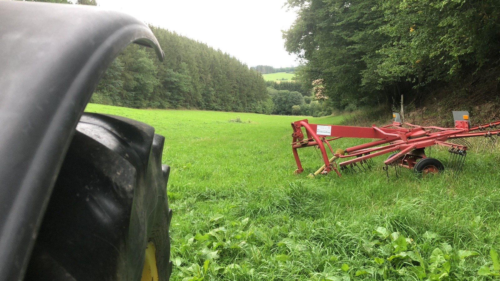 Het is nog pikkedonker als ik, heel voorzichtig weer plaatsneem in het grondzitje, met de FLIR scan ik het dalletje en de bosschages ernaast, maar ik zie niets. Het gekras van kraaien kondigt de dageraad aan; de zwartrokken zijn er altijd vroeg bij. Als de duisternis begint te verdwijnen zie ik imposante gestalten op het gras staan. Nee, geen roodwild maar een tractor en een grasschudder. Op die laatste zie ik een pamflet: ‘zu verkaufen’. Nou, als de verkoop via het pamflet op deze afgelegen plek moet komen, dan is de kans van mij op roodwild groter dan op die verkoop, zo mijmer ik. De boer moet die werktuigen gisteravond wel heel laat hier hebben neergezet. Maar laat ik nu eerst maar proberen dat kleine bokje te schieten voor ik aan roodwild denk; die jonge J., die snotneus wil ik graag de mond snoeren.