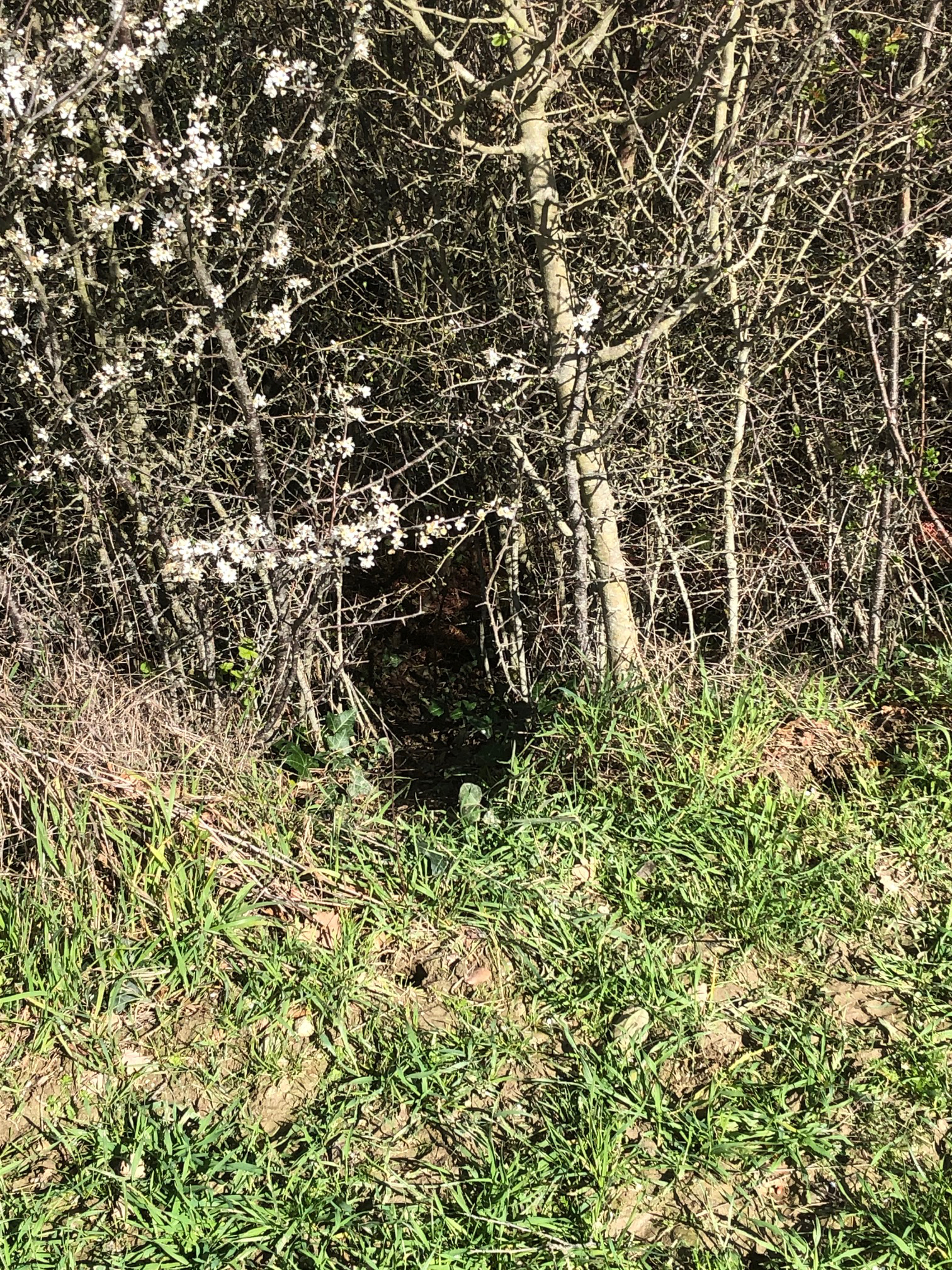 Hoewel het nog tamelijk koud is, begint de koolzaad, hoewel nog lang niet volgroeid, al langzaam in bloei te komen. Door het relief in het terrein kan ik in de koolzaad een aantal wissels zien die van het ene naar het andere bos lopen. In het ene bos weet ik een paar zoelen, waar ik even polshoogte ga nemen. Ik zie dat de varkens daar nog steeds van de diepe kuilen in de klei gebruikmaken. Aan de hoogte van de klei op een paar bomen, die ze gebruiken om tegenaan te schurken, kan ik zien dat er hier regelmatig een paar grote jongens langs komen. Tegen de wind in ga ik ook bij het andere bos kijken. Daar is een paar jaar geleden behoorlijk wat hout uitgehaald en de opslag vormt inmiddels een mooie dekking. De wissels in de koolzaad eindigen voor de varkenstunnels in de sleedoorns die daar voor varkens een ideale dekking vormen. Eigenlijk weet ik genoeg, maar als Diane met een lang gestrekte nek aangeeft dat er daar, in die dekking…., dan weet ik het zeker.