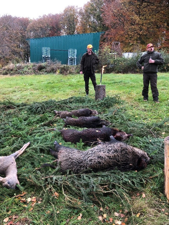 Bij de jachthut druppelen langzaam alle deelnemers binnen. De buit valt niet mee, sterker, het valt de jachtheer tegen. Uiteindelijk liggen er na het ontweiden vier varkens en een ree op de Strecke. Het blijkt dat er heel veel varkens ondanks het goede drukken naar onze posten toch naar de buurvelden zijn ontkomen. Dat waren de (verre) schoten die ik hoorde, want in het directe buurveld lagen maar liefst 18 varkens op de Strecke.