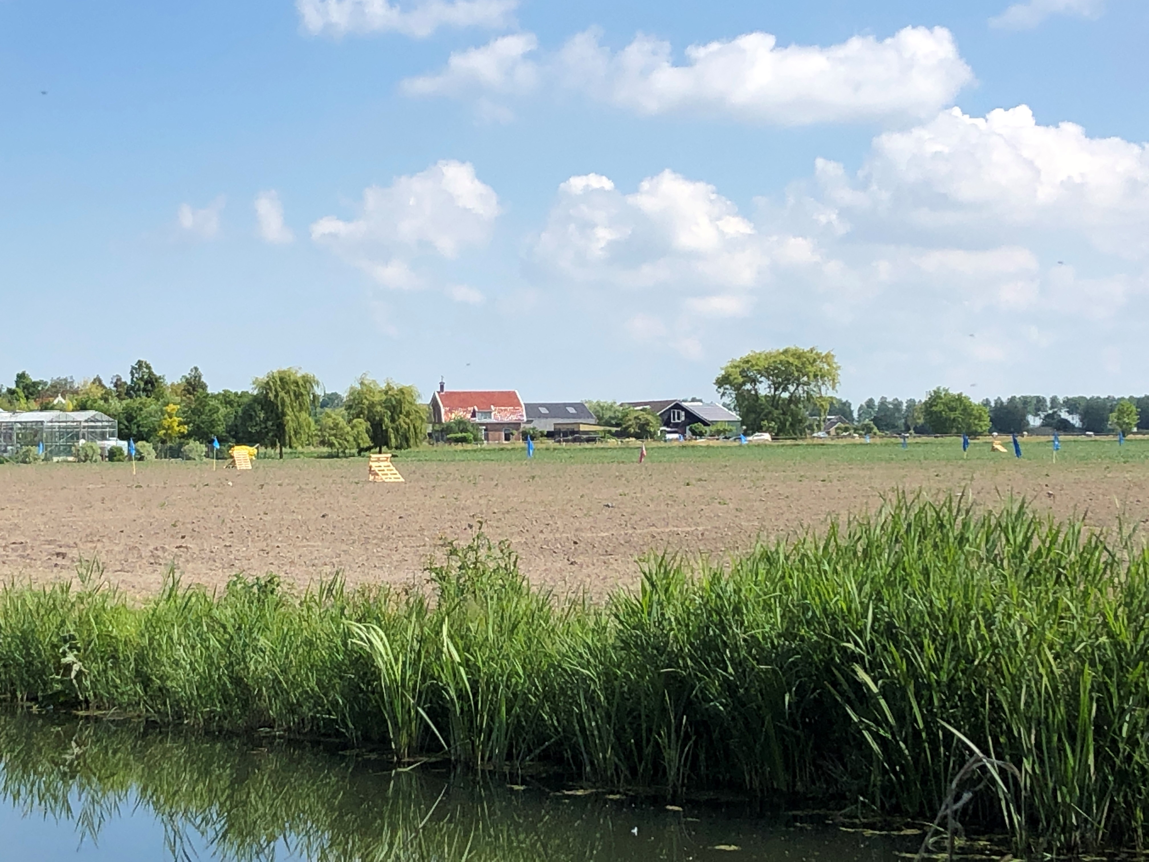 Vanmiddag liep ik daar de honden uit te laten, er was geen gans te zien, maar wel pallets die de boer verspreid, als waren het jachthutjes, tussen de spruiten had neergezet.