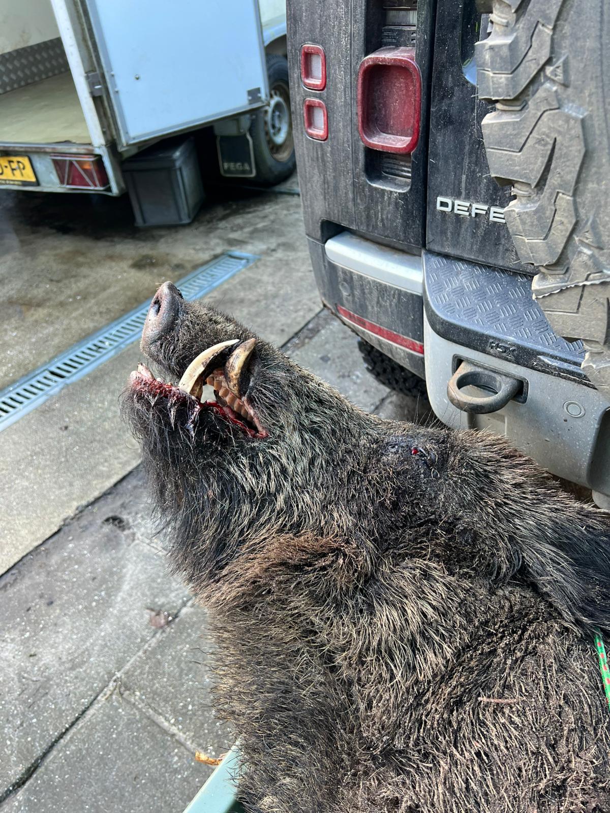 Ik heb G. aan de lijn. “Ik heb wel eens vreselijk veel moeite moeten doen om een keiler te kunnen schieten. Maar ik kreeg ik zojuist een niet te missen kans op een grote keiler met geweldige geweren. Ik ben nu onderweg naar de koeling, ik stuur je zo dadelijk wel een fotootje”.