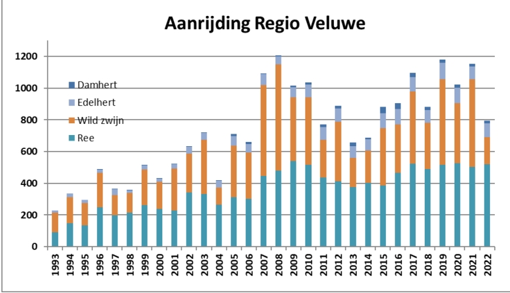 Op de Veluwe vallen er jaarlijks zo’n 900 stuks grofwild ten prooi aan het verkeer. En dat zijn slechts de dieren die dood worden aangetroffen of na een nazoek door een zweethond alsnog moeten worden afgeschoten door een lid van het valwildteam om ze uit hun lijden te verlossen. Want niet alle aanrijdingen worden gemeld, bijvoorbeeld omdat de auto slechts WA verzekerd is en de schade dus niet op de verzekering verhaald kan worden. Dan volgt er geen nazoek en dus mogelijk tot onnodig lijden van het wild.