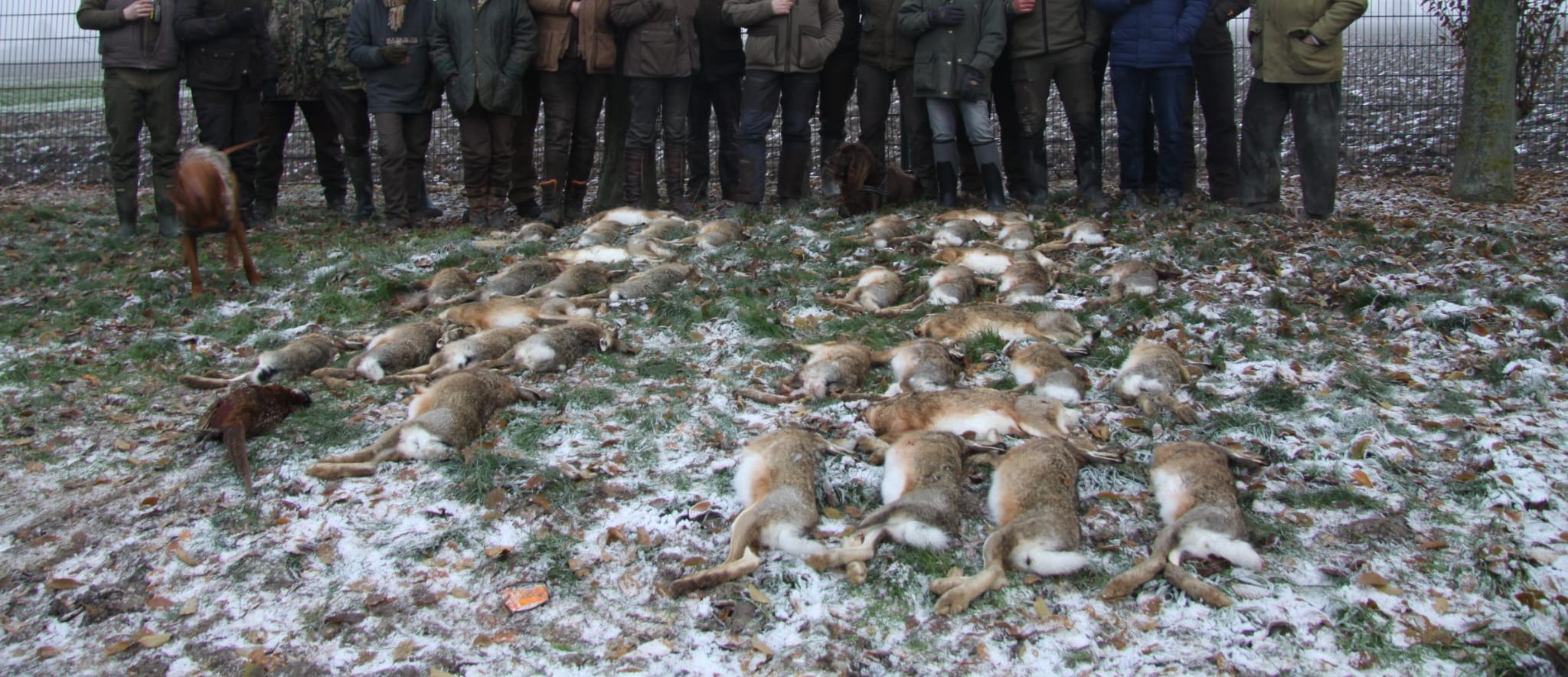 De hazen worden netjes, allemaal ‘zoals het hoort’ op hun rechterzij op het grasveldje gelegd, waar we tableau maken. Jagers en drijvers stellen zich er achterop, voor de afsluitende toespraak en daarna de traditionele foto.