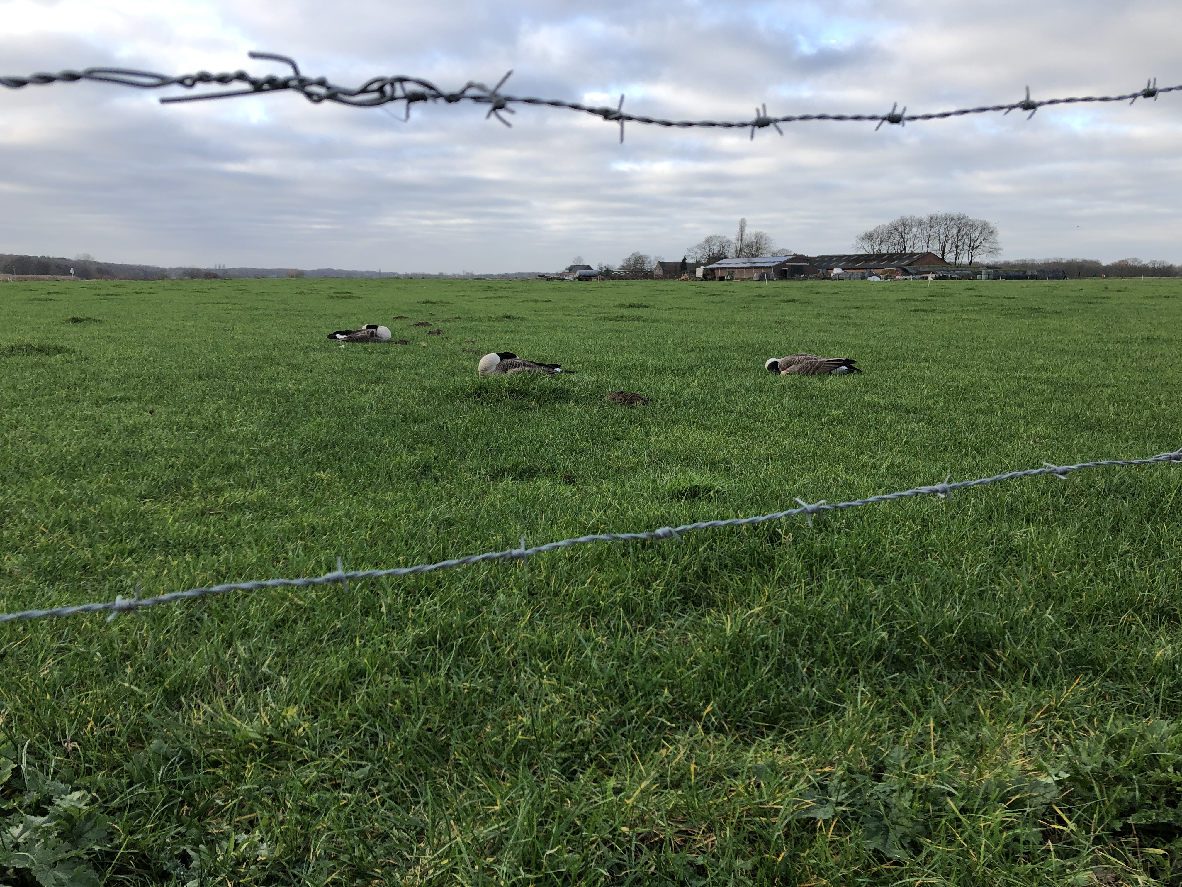 “Kijk” zegt hij, “de ganzen liggen in de kom voor de sluis al met honderden naar ons te loeren. Jammer dat B. weer eens te laat was, want we hadden hiervoor mooi natuurlijk wat al eerder moeten zitten”.