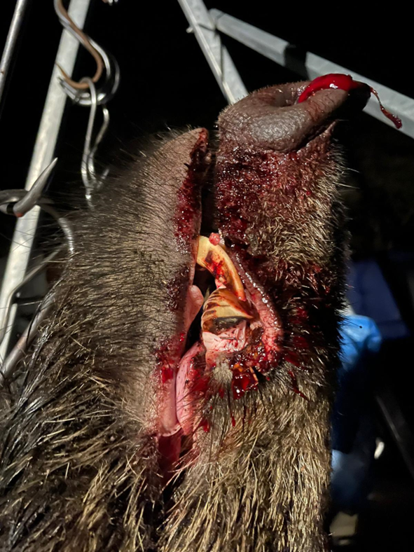 Dan een bericht van R. dat de keiler binnen is en de vraag wat ik wil. “Warme kachel, Jägermeister en hete kip”, antwoord ik. Hij komt mij halen, laat hij weten. De keiler is bij de Jachthut al opengebroken en hangt uit te dampen.