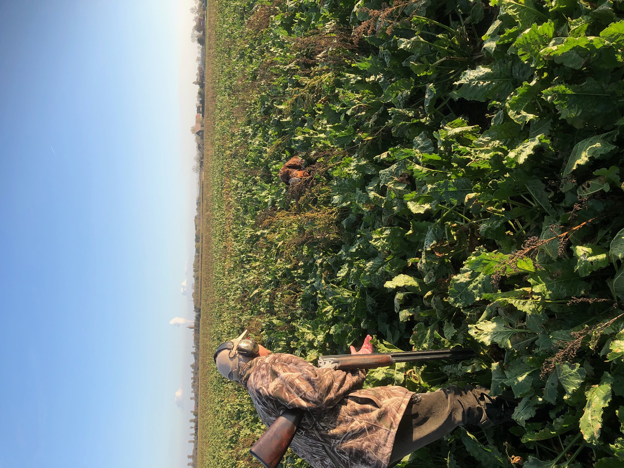 Zo snel mogelijk ga ik er dwars door de bieten naar toe. Eigenlijk verwacht ik weer een hen, maar je weet immers nooit, en als een standbeeld staat de Langhaar en hij heeft het wild echt vastgezet. Onderwinds loop ik een beetje met hem op, dan gaat de fazant, een haan dus, op. Prachtige spanning bij mij en bij de hond, dit is het ultieme jagen voor het schot. Nu ben ik aan de beurt, de haan neemt snel hoogte en dan schiet ik. Op karakteristieke wijze vouwt de haan zich en valt in de spruiten. De Langhaar is gaan zitten. Nu is het weer zijn beurt: apport; hij heeft de valplaats goed gemarkeerd en zonder problemen vindt hij het wild en komt de haan bij zijn baas brengen. Even later heeft C. nog een bijna identieke kans, die eveneens door de Langhaar wordt binnengebracht. Mooi honden, die zowel voor als na het schot hun kunnen laten zien.