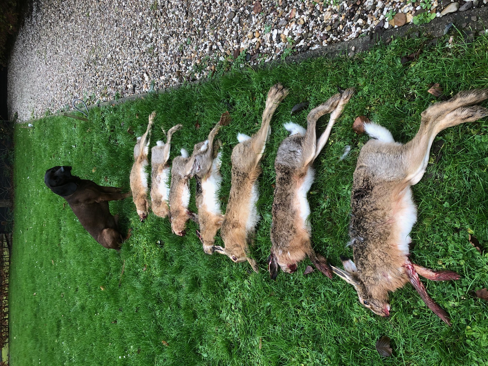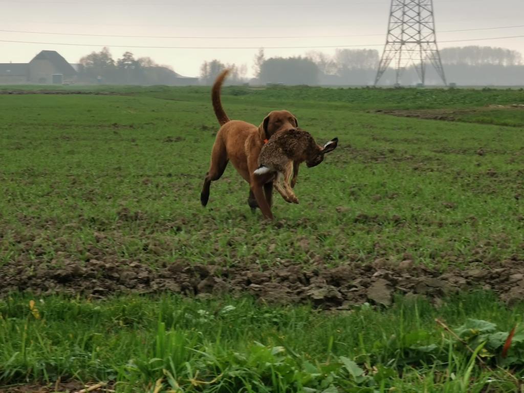 T. zie ik over de restanten van de bloemen en kruiden lopen, kennelijk vond hij de tocht door de rammenas te zwaar, de dagen gaan meetellen… Ik gebaar hem in de richting van het haas, dan zet hij zijn jonge Chesapeake in. Er is even aarzeling, sloot over of niet, kijken naar de baas, maar die negeert -verstandig- deze hulpvraag. Niets doen, als het kan, bevordert het zelf oplossend vermogen van je hond. Dan springt ze over pakt het haas op en loopt een klein rondje. Een fluit signaal klinkt, hond bij de les houden: apport! Dan komt ze, haar eerste warme haas is een feit.