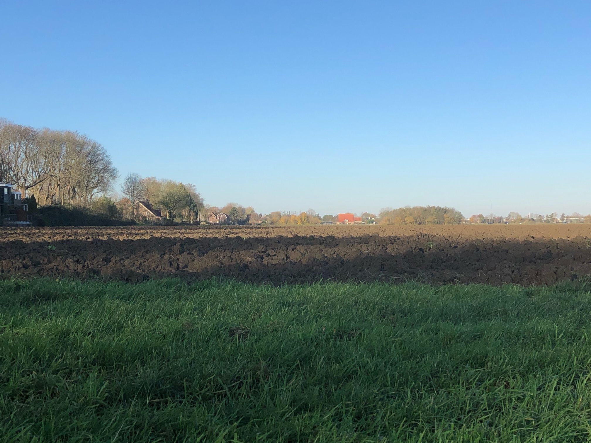 Ik parkeer de auto op een dammetje en posteer mij op de hoek van een veld met bladrammenas en een pas ingezaaide wintertarwe-akker. Vandaar heb ik een mooi overzicht, ruim 400 meter van de groenbemester voor mij en daarachter lopen T. en S over de pas omgeploegde akker, waar we hazen verwachten. Ik zie de mannen en de hond heel rustig de akker afdrijven, maar zie geen enkel haas op de lopers komen. Als ze aan het eind van de akker zijn gekomen zoeken we telefonisch contact. Her blijkt dat er in het begin, voor mij nog ver weg, wel een paar hazen waren opgegaan, maar dat ze allemaal buiten schot in de rammenas waren verdwenen.