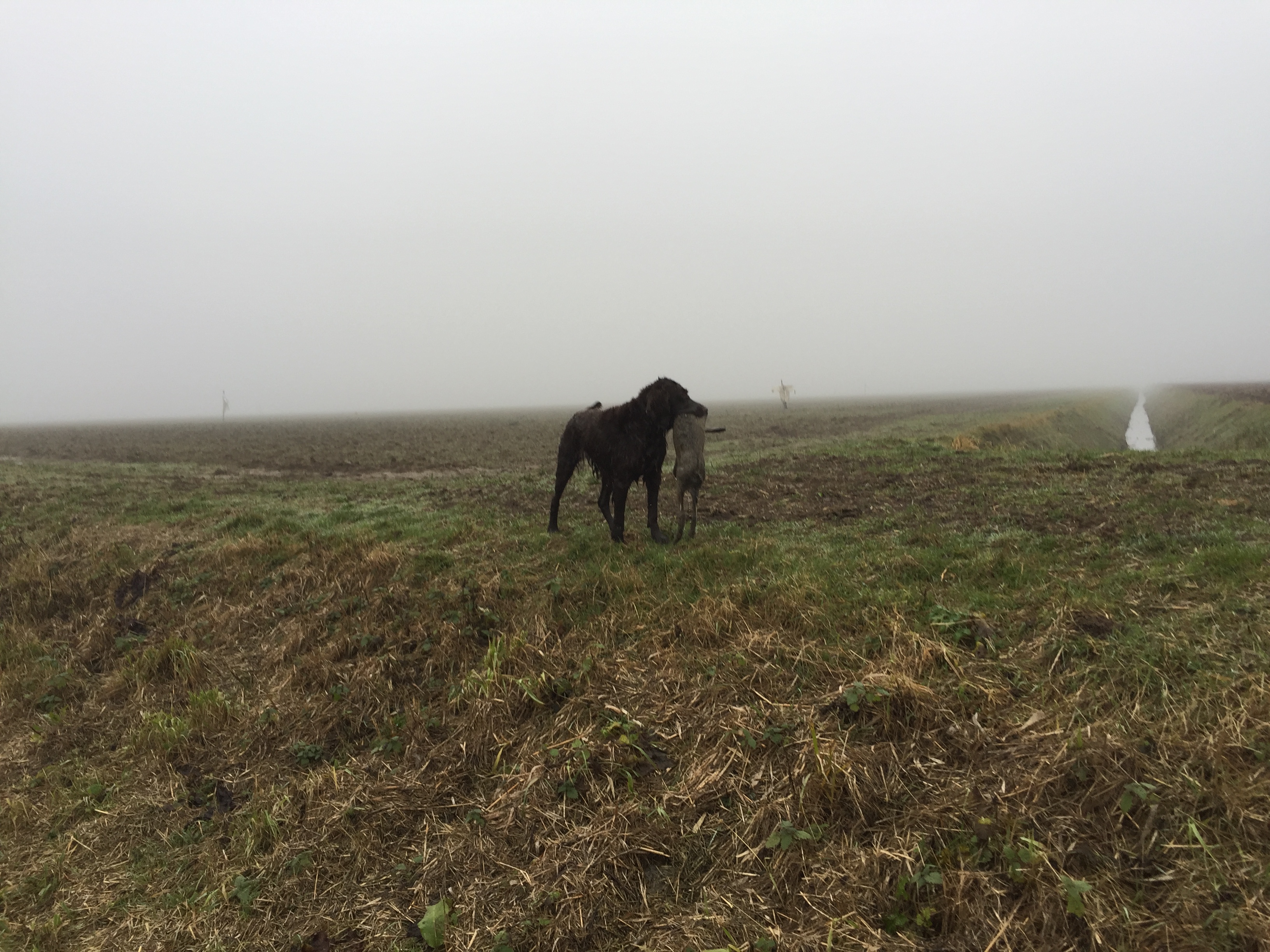 Er werd een haas geschoten terwijl ik aan de andere kant van de drift liep. Het haas was geschoten aan de andere kant van een brede sloot (niet erg slim van de schutter, maar goed). De drift stond stil, en ik stuurde Diane dwars door de linie richting het haas. Zeker 150 meter.
