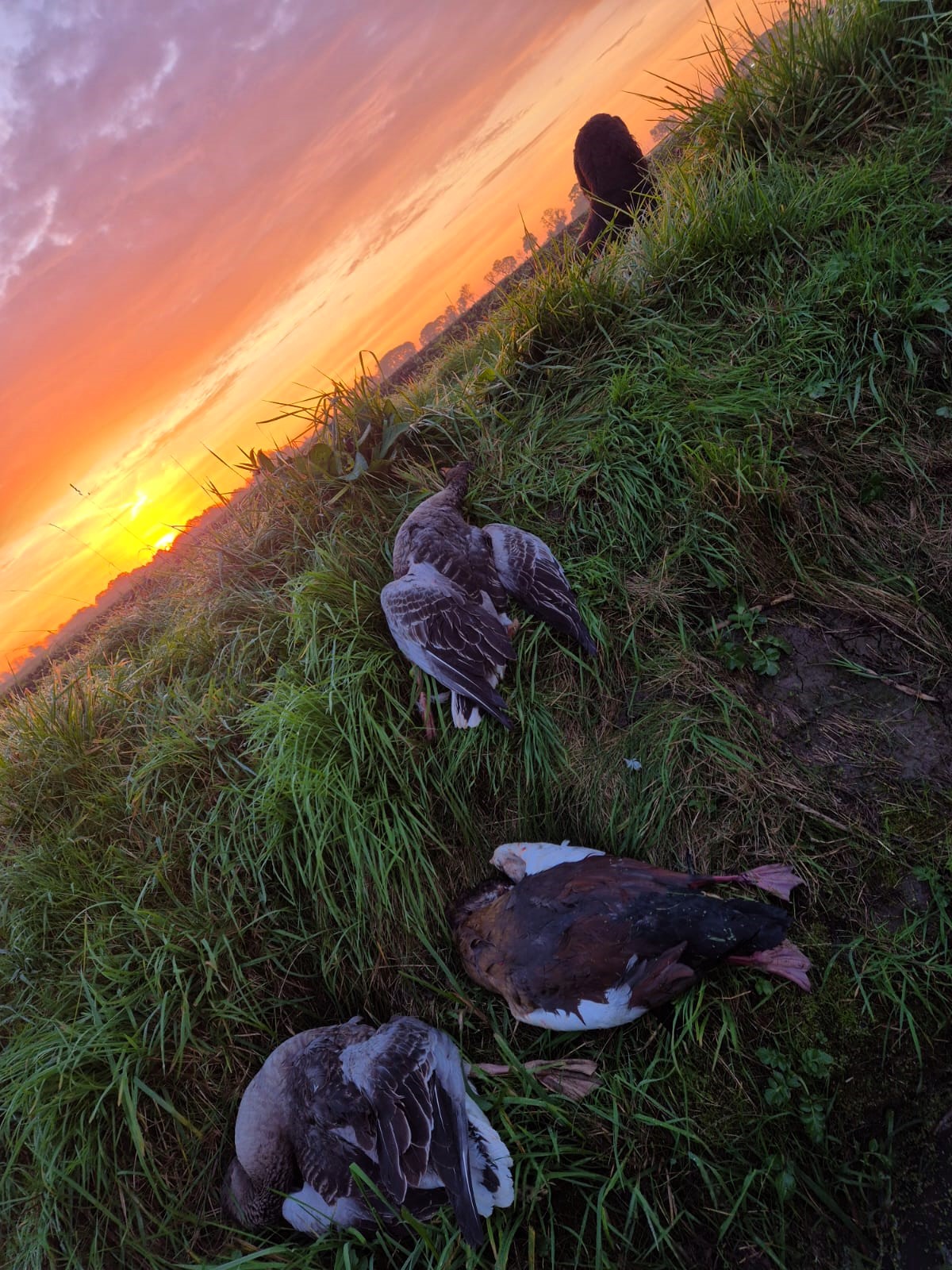 Ik zie S. ook de sloot inschuiven en zijn langhaar Teun naast hem afleggen. Hij zo positioneert hem zo dat Teun ook kan zien waar mijn ganzen zullen vallen. Zelf heb ik een paar maanden geleden afscheid van Diane moeten nemen. Zonder sentimenteel te willen zijn: ik mis haar nog steeds. Prachtige jaren hebben wij met haar beleefd.