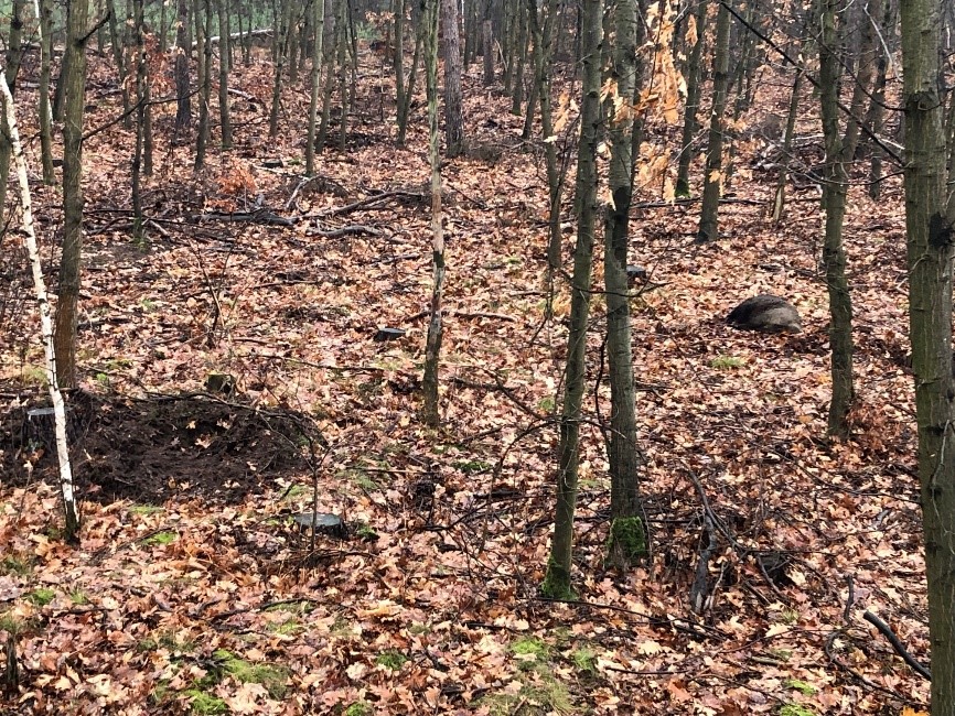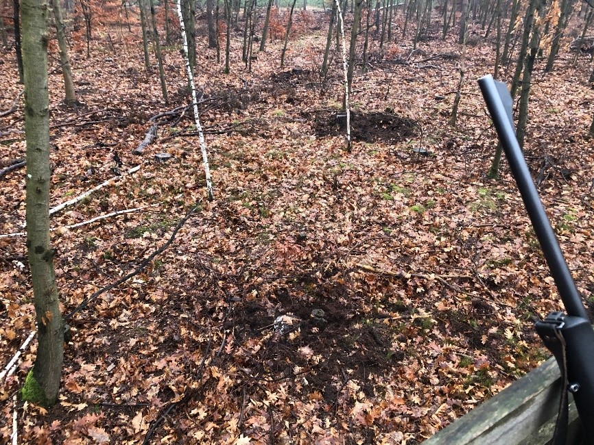 Het eerste wat ik zie biedt hoop: verse sporen van varkens die rond eikenstronken op muizenjacht zijn geweest. Varkens zitten er vast en zeker hier in deze hoek van het bos.