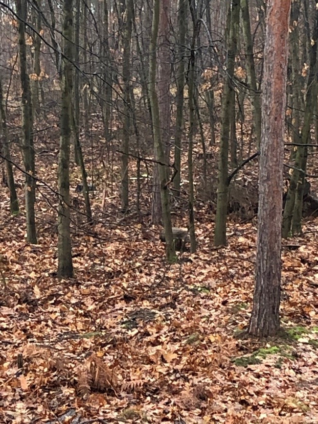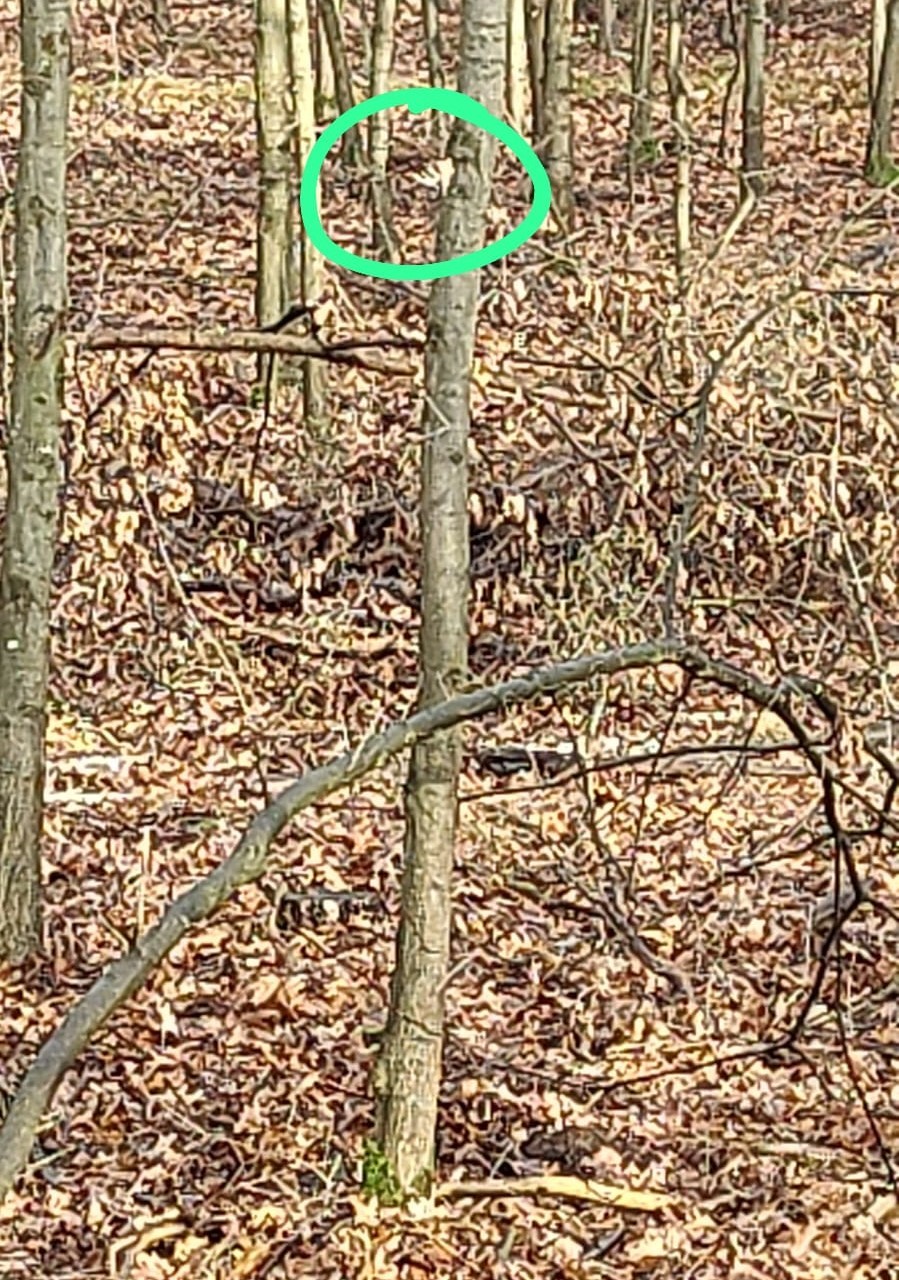 Ik zie twee reeën, ik vermoed geit met kalf, het pad oversteken, ik schat op zo’n 300 meter. S. zie ik wel die richting uit kijken, maar kennelijk komen ze niet door, want ik zie hem niet reageren.