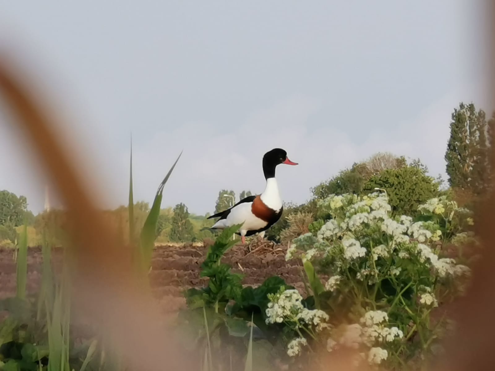 Twee bergeenden landen dicht bij mijn hutje, het mannetje komt recht op mij aflopen, maar vertrouwt het kennelijk toch niet. Als snel besluit hij, gevolgd door het vrouwtje, om weer te vertrekken.