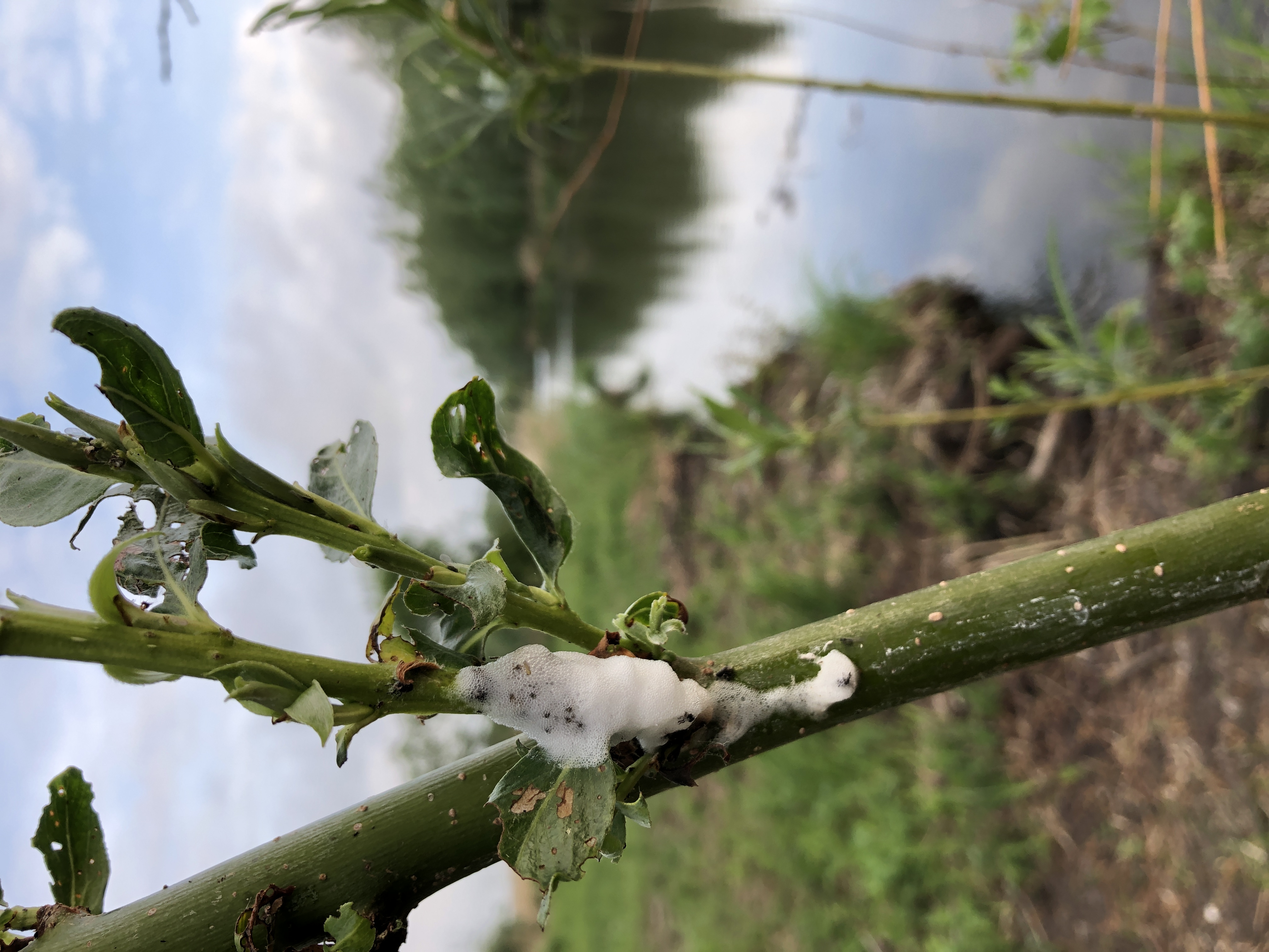 Nog voor ik hem kan antwoorden valt mijn oog op een verse wilgentak van mijn hutje die wat aan het uitlopen is. Spuugbeestje, maar het verschijnsel wordt ook wel koekoeksspuug genoemd. Toeval bestaat niet, koekoekt de koekoek achter mij.
