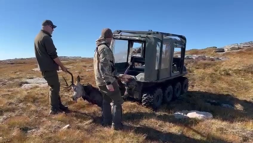 Dan is het tijd om op te breken. Het hert wordt in de Argo getakeld. Zo’n lier hadden ze een paar jaren geleden ook moeten hebben. Het had mij een ernstige blessure kunnen besparen en zodoende een operatieve ingreep kunnen voorkomen.