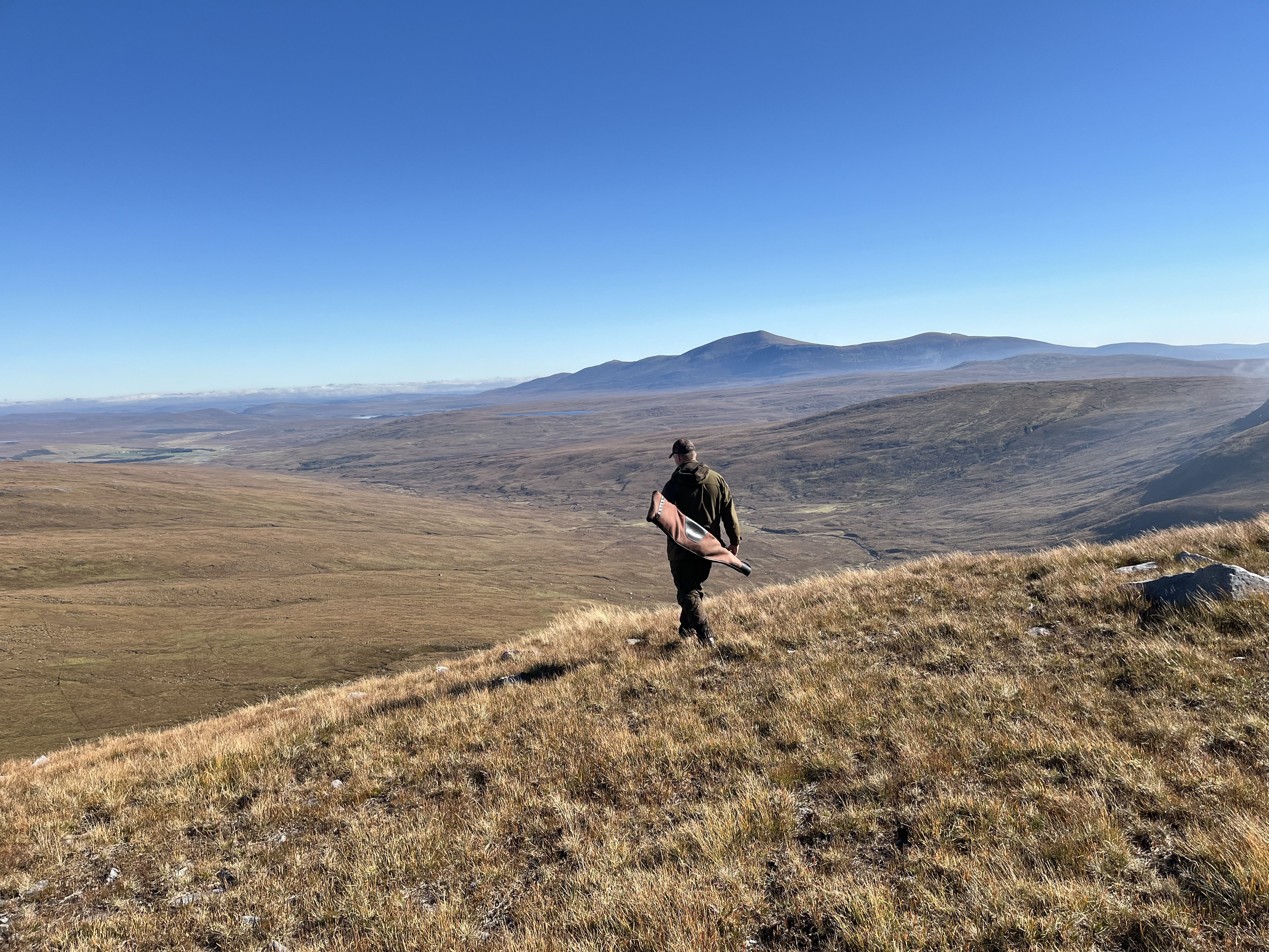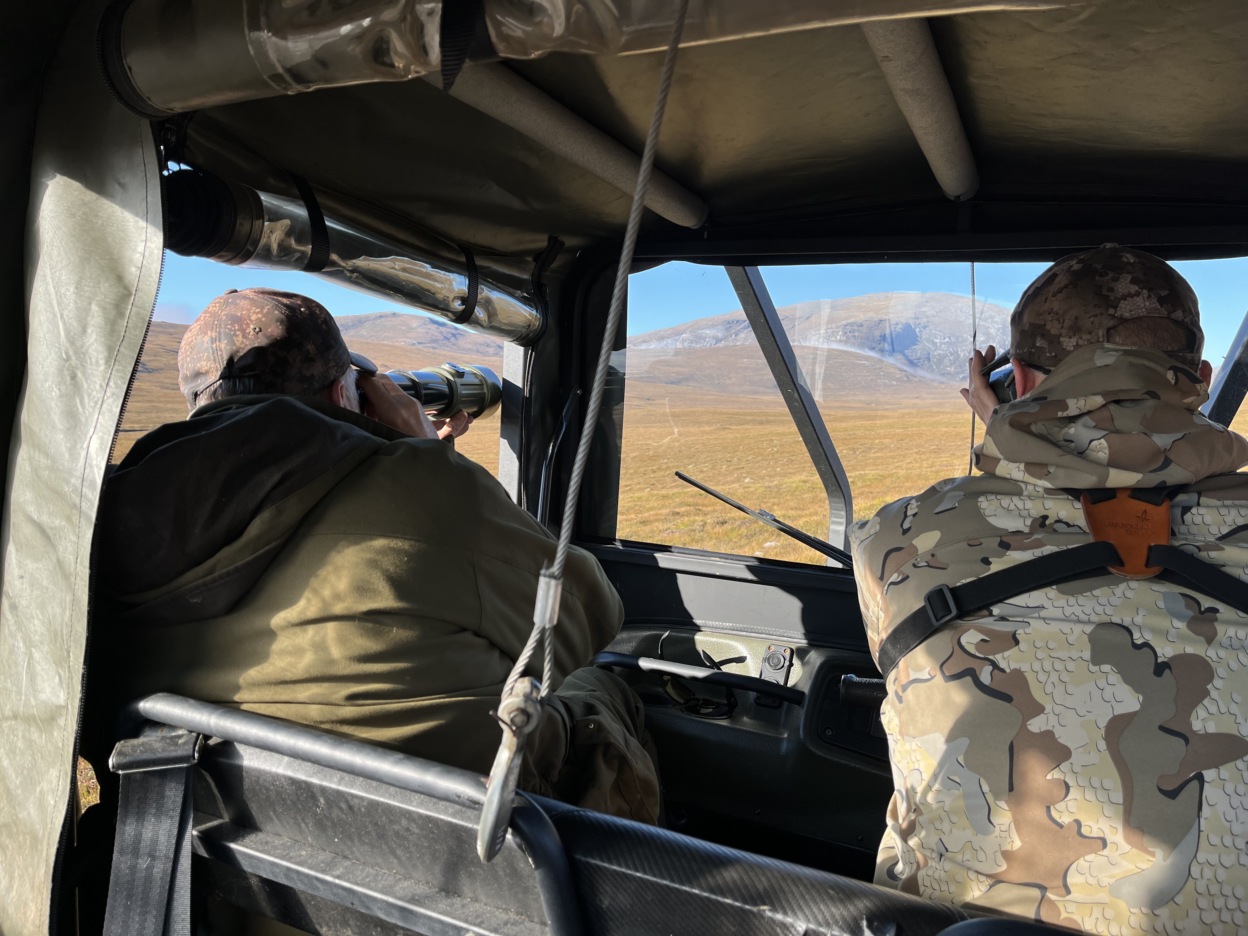 Voorzichtig trekken we verder en zoeken de luwte op om daarna opnieuw ons heil hogerop te zoeken. Telkens voorzichtig over de heuveltjes speurend naar roodwild, totdat de stalker opeens ineen duikt. Hij heeft een volwassen hert gezien, op zo’n 500 yards rechts voor hem. Tussen het hert en ons is weinig reliëf en we zullen ons een stuk moeten laten afzakken om daarna te proberen ongezien het hert te benaderen.
