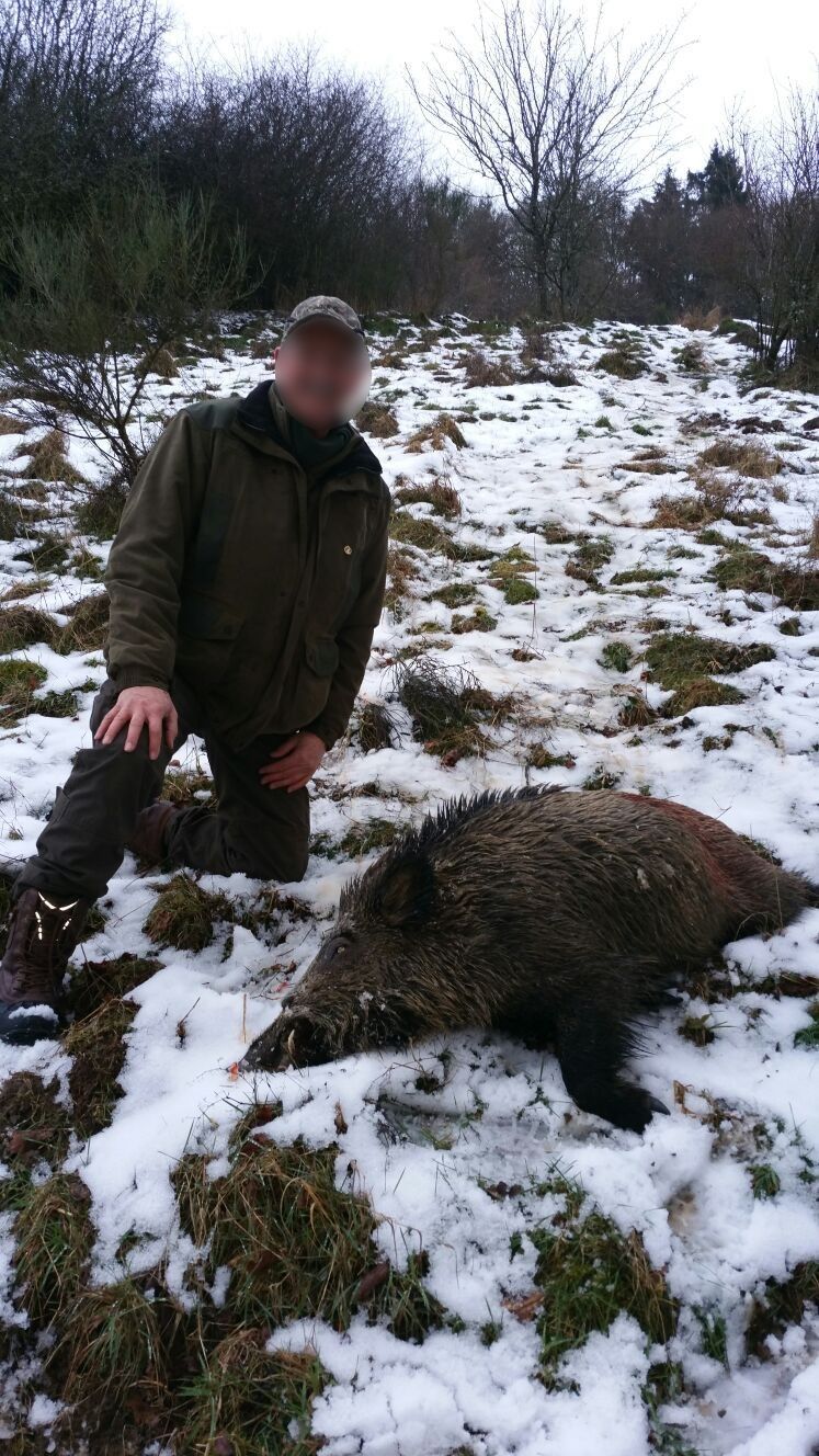 Maar opeens ben ik alle kou vergeten. Ik zie onder mij in het dalletje een groot varken lopen. Ik denk dat het een keiler is, geen kleine jongen, maar tot een schot kom ik niet want hij is alweer uit mijn zicht verdwenen door de bosschages daar.