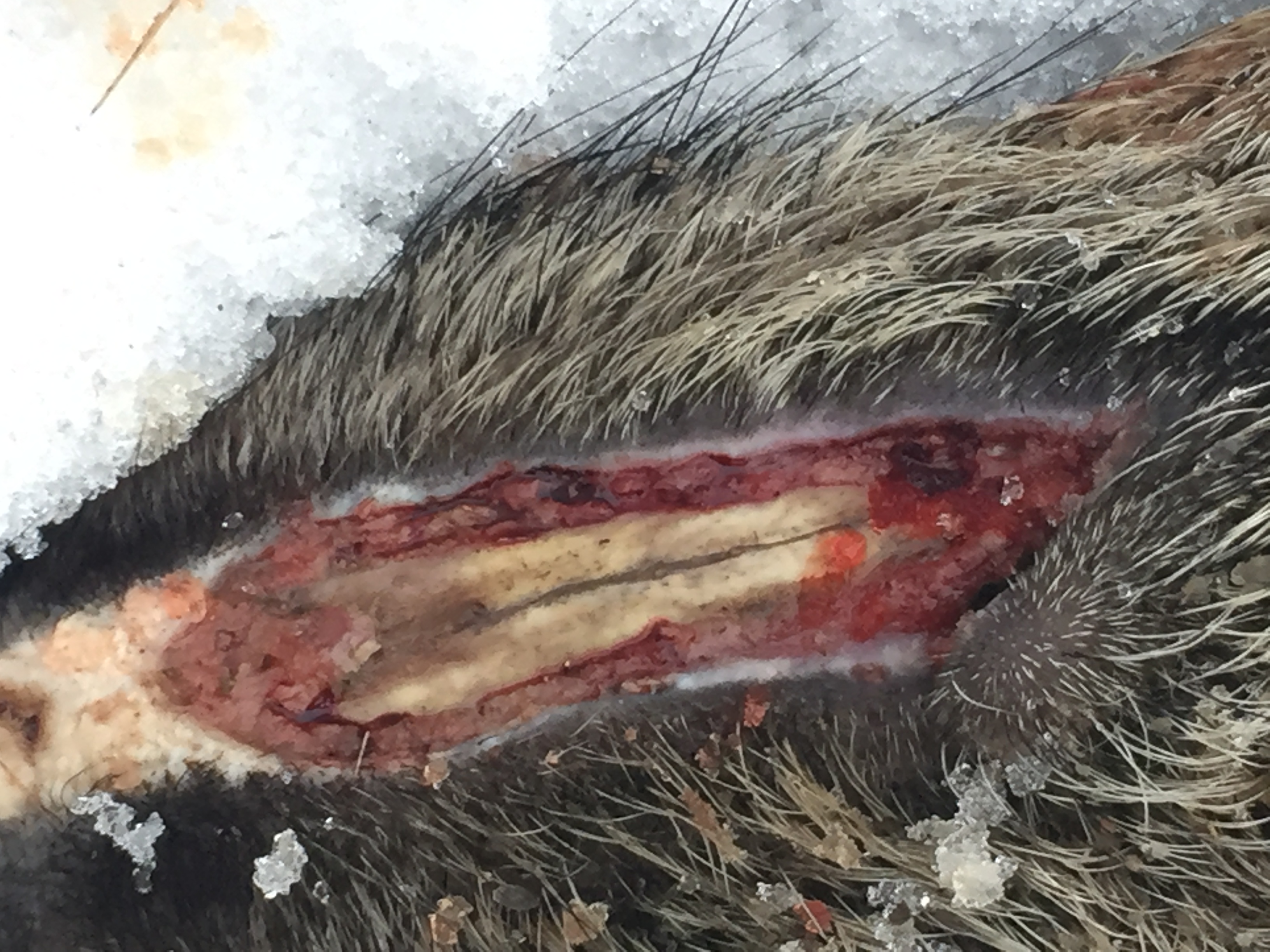 Als we het varken op de wilddrager willen tillen denk ik weer aan die beschadigde neusbrug. Bij bestudering is de wond ernstiger dan ik eerst dacht. Het neusbeen is al bloot en het lijkt erop dat een ontsteking naar binnen is geslagen.