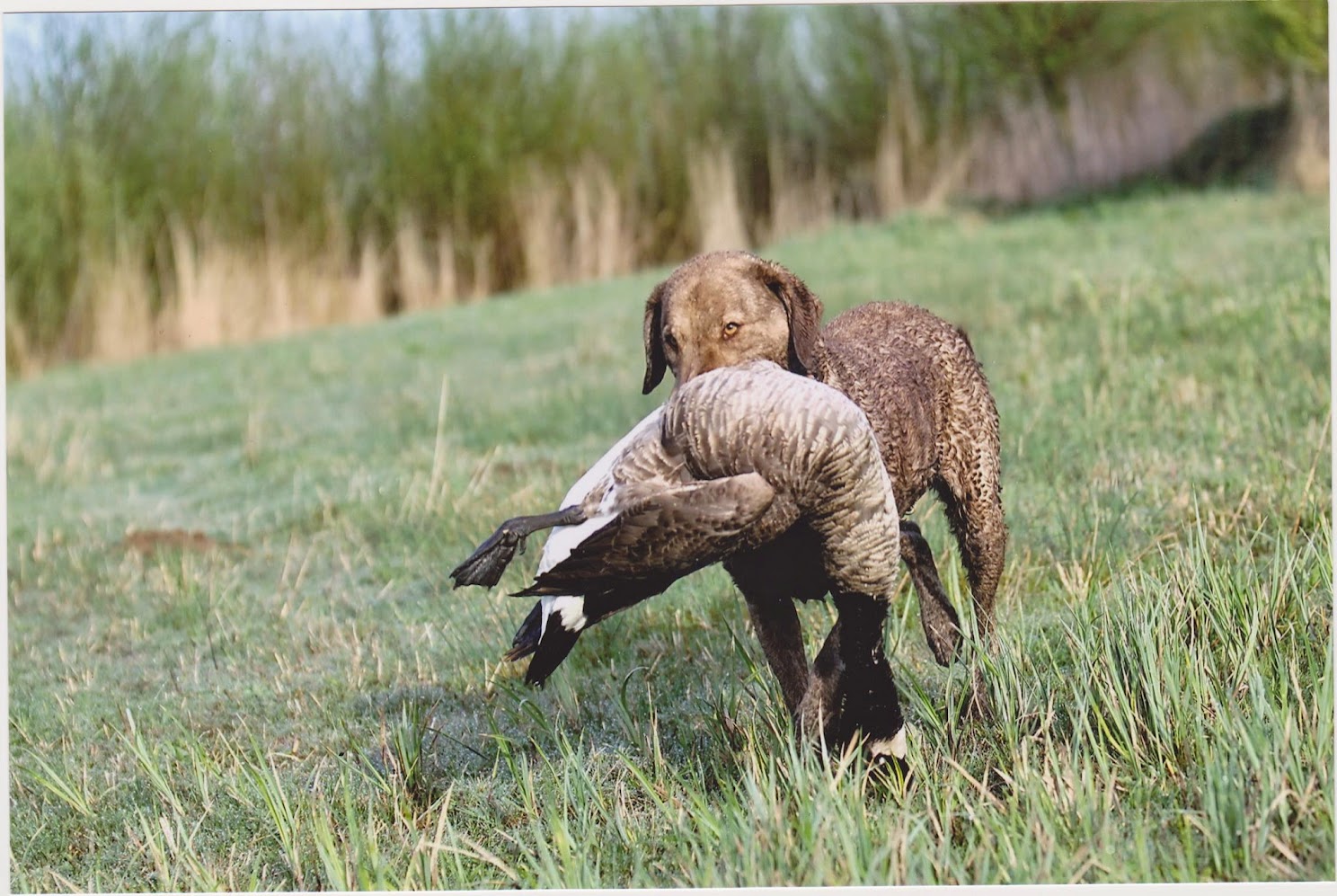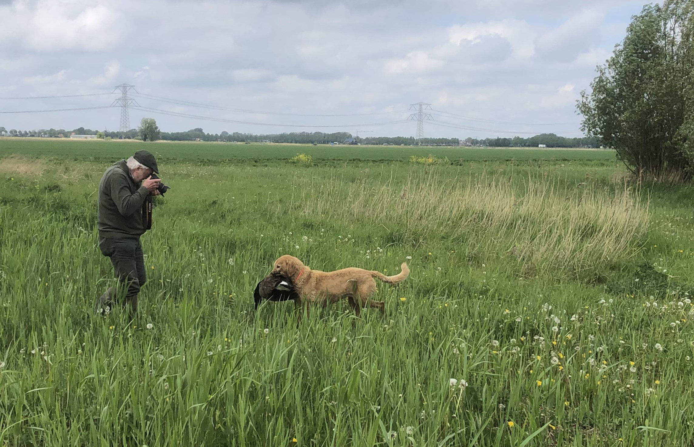 Ik stuur Guus over, naar de akker waar mijn gans is gevallen. Dat lukt zonder mankeren en snel komt hij weer terug gezwommen om mij mijn buit te brengen. Samen lopen we in de richting van zijn baas en als ik de eerste van diens twee ganzen zie liggen, zet ik Guus in. Als hij de gans heeft gevonden roept zijn baas, “apport”! Guus kijkt naar mij, kijkt naar zijn baas en neemt een besluit. Hij komt de gans bij mij brengen, die prachtige, goede allemans vriend.
