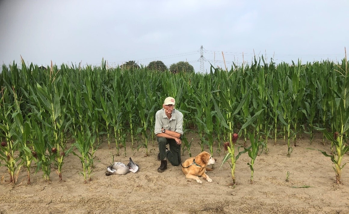 Het is prachtig weer, dus B. en ik maken het ons comfortabel in de dekking van de mais. Prachtig weer, koelbox met fris, kaas en worst. Maar er vliegt helemaal niets, tot dat er een eenzame gans aan komt vliegen. We signaleren hem al van verre, want soms is het bijna niet te bevatten hoeveel geluid één enkele gans kan maken. Met een grote boog vliegt hij bij ons langs en we kunnen hem slechts nakijken.