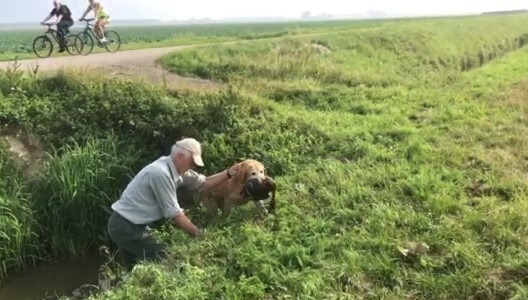 B. is inmiddels uitgestapt en met Noor komt hij mijn kant uit. Hij laat Noor los, die de sloot induikt. Daar staat ze dan, eend in de vang, omhoogkijkend. Want het is een steile kant, te steil voor haar. Als ik mijn geweer in de graskant leg en Noor wil helpen, zegt B. gedecideerd: “nee, het is mijn hond” en hij gaat door de knieën en laat zich een stukje omlaag zakken.