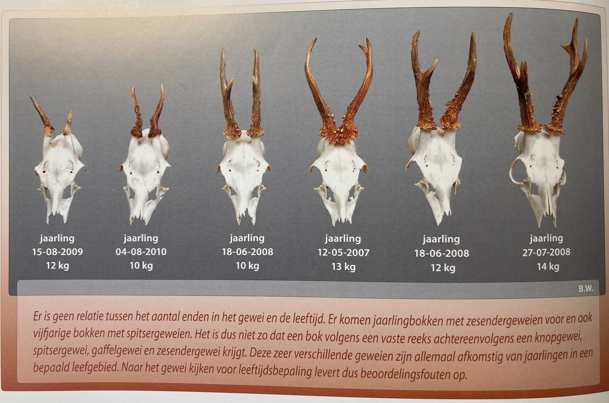 Leeftijdsbepaling op basis van het aantal enden van een gewei is onbetrouwbaar. Dat heeft Hans Bulder, de bekende wildschilder, mooie verbeeld met zijn afbeelding van de zes jaarlingengeweien in het boek ‘Het Ree’. (Uitgave IPC, inmiddels uitverkocht).