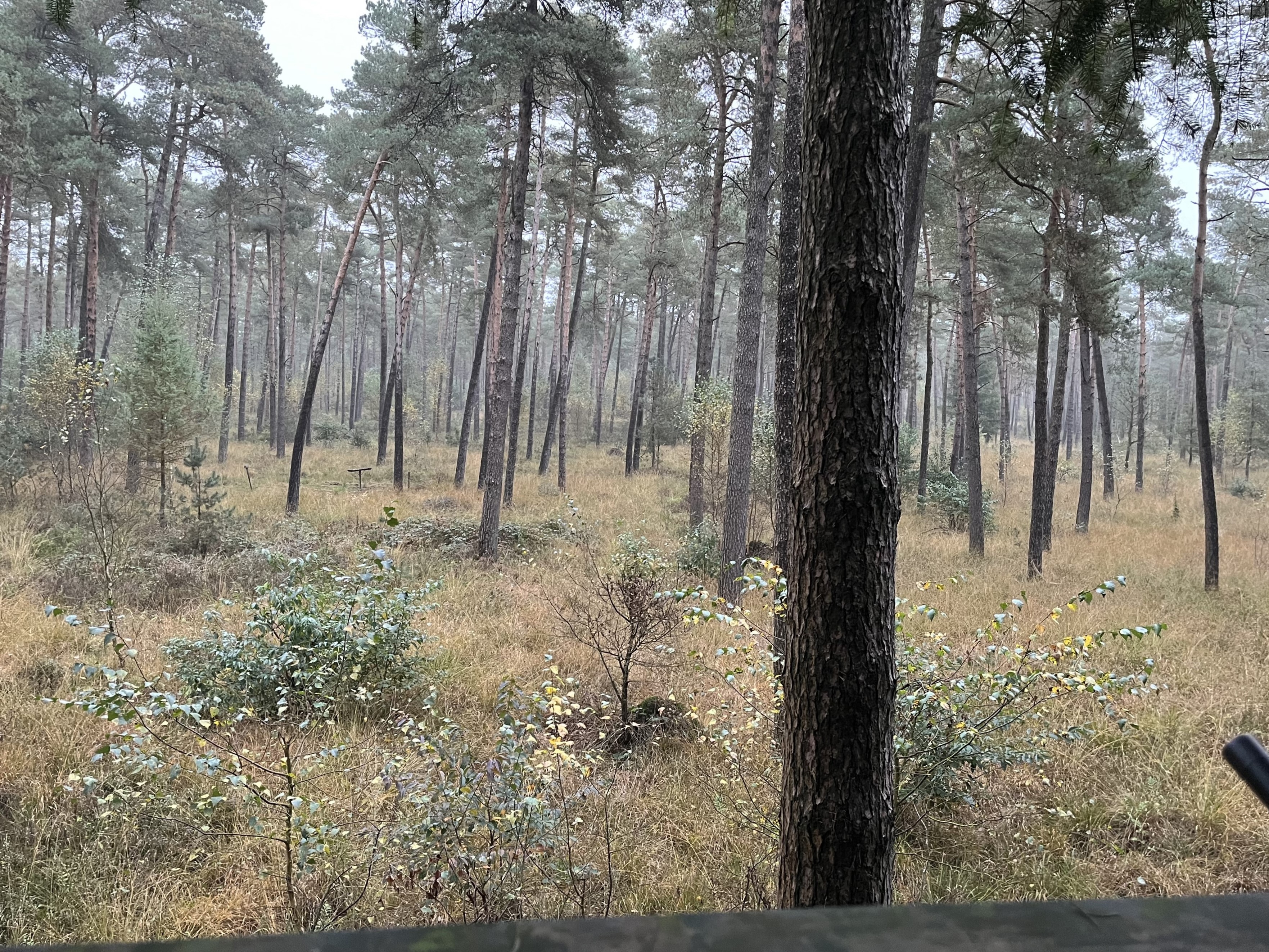 “Pas op”, had de jachtopzichter gezegd, ”ik heb ze de afgelopen week daar ook overdag gezien. Het kan dus dat ze er al staan voor jullie bij de ladder zijn aankomen.” Wellicht dus nóg voorzichtiger dan normaal benaderen we het mooie open stuk bos waar we straks zullen aanzitten.