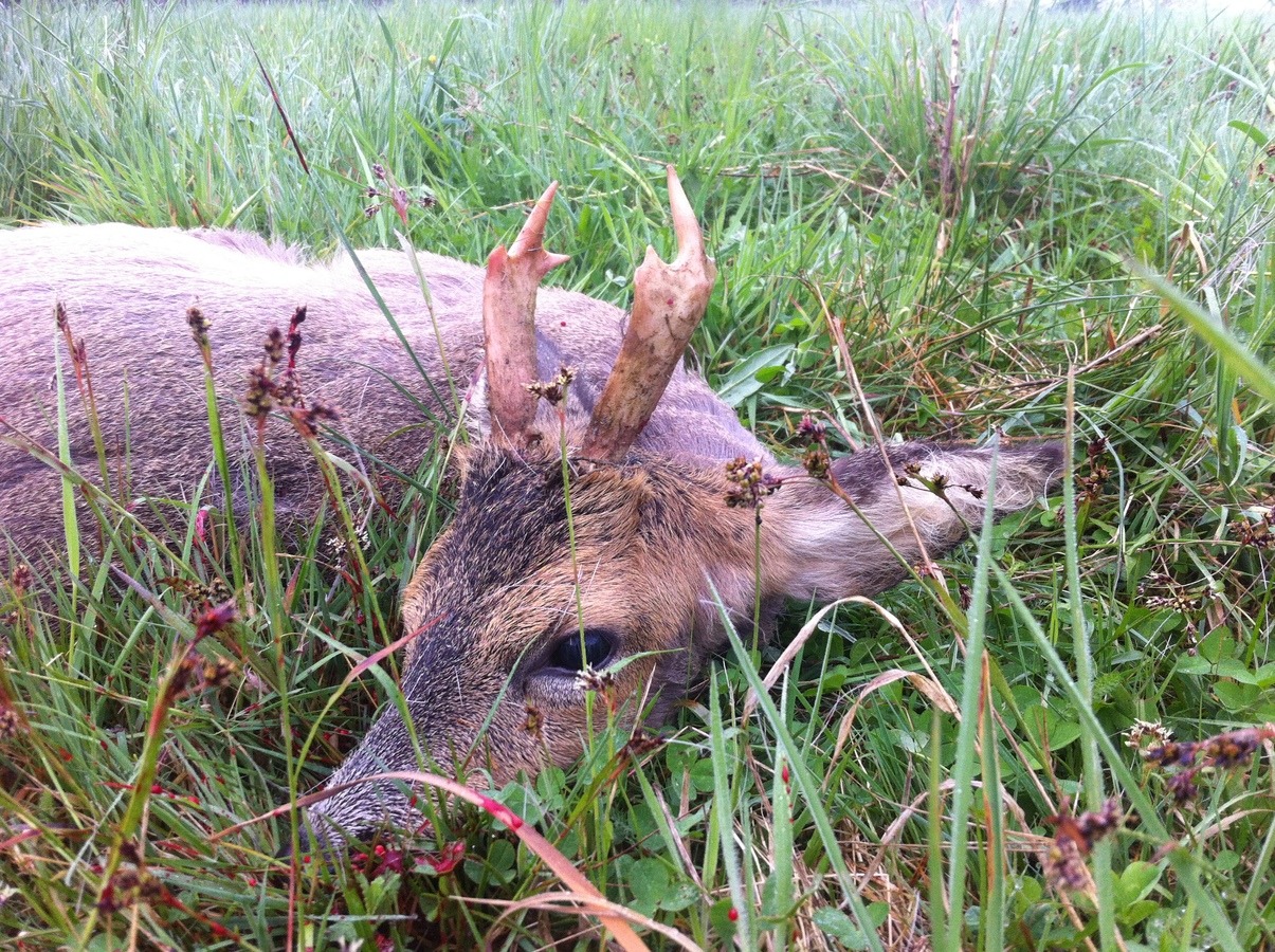 De wekker heb ik op 5 uur gezet, maar ik ben voor die tijd al wakker. Kopje thee, krentenbolletje en ik ga op weg, richting Kapel. Ik zet de auto een paar honderd meter er vandaan op een bospad en sluip richting Kapel. Het schemert nog, maar ik zie hem al lopen. Nog geen 100 meter van mij vandaan. Van een schot kan geen sprake zijn: achter hem ligt het dorp. Ik maak een omtrekkende beweging, waarbij ik hem een kwartiertje uit het oog heb. Maar, gelukkig staat hij er nog als ik vlakbij onze garages ben, al is hij wel wat verder getrokken op de wei. Vanaf die plek zou ik hem kunnen schieten, maar ik moet nog wel iets opschuiven er zit een glooiïng tussen ons.