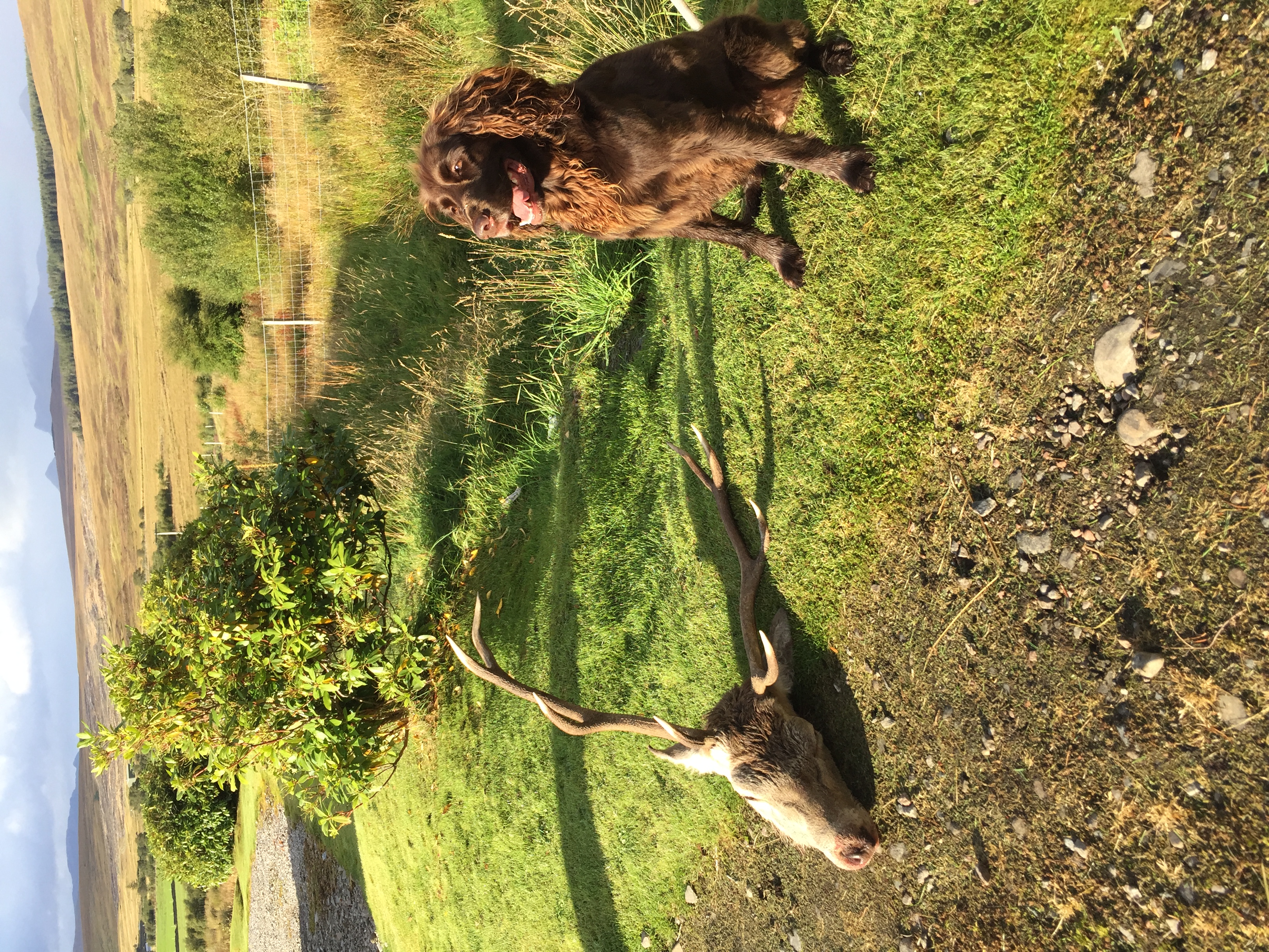 Aan tableau maken doen die Schotten niet, maar Diane gaat samen met het hert, nou ja de kop, op de foto. De teckel heeft er geen zin in, die bleef in de larder, want misschien viel er daar iets te snaaien.