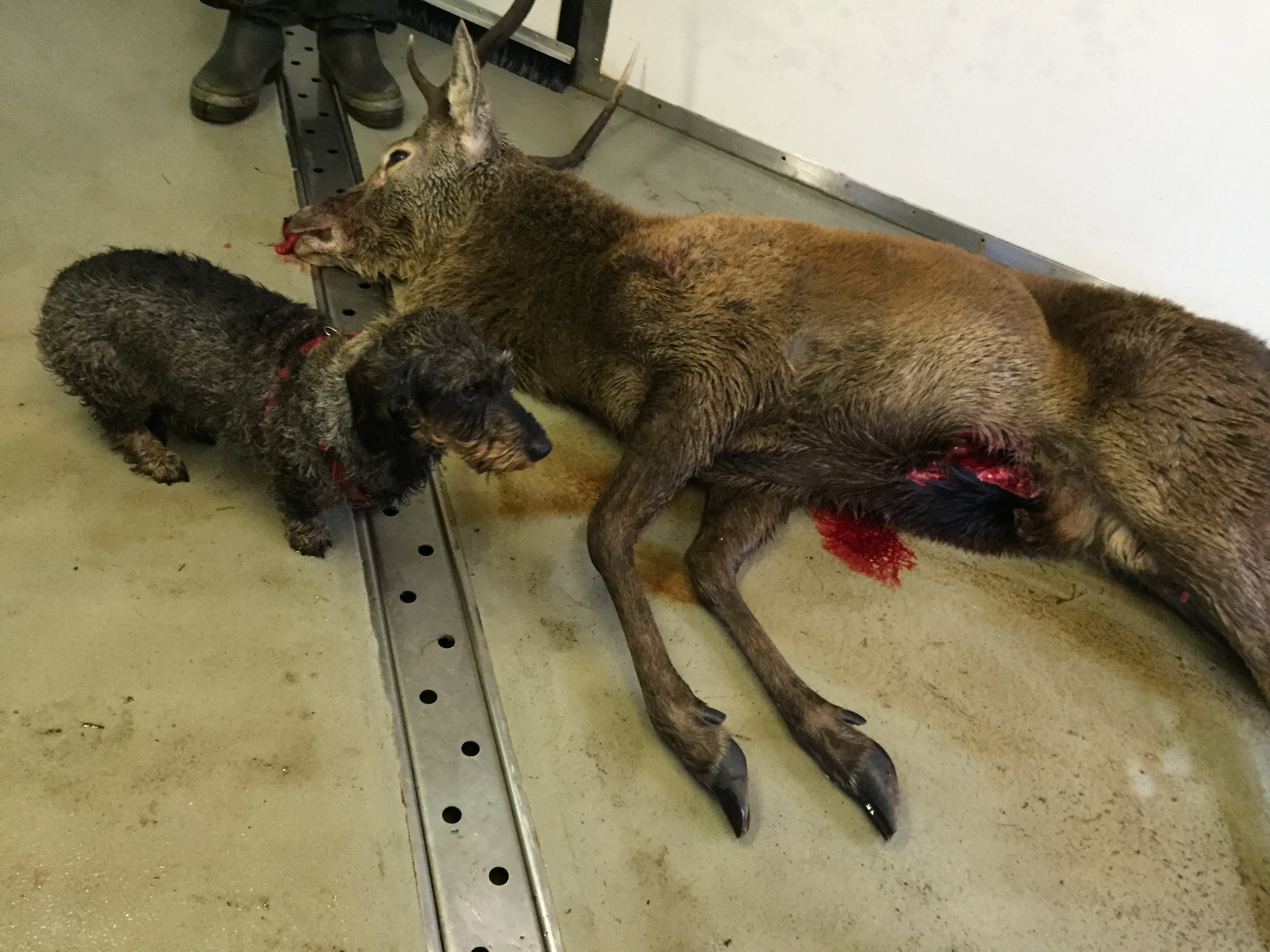 Als we op een dag een toeristische trip gemaakt hebben, komen we omstreeks 16.00 uur thuis. Daar hangt een briefje aan de deur: “Hert zoek, hond nodig”. Ik probeer P. te bellen, wat pas na vele pogingen lukt. Hij legt mij uit waar ik met Sophie naar toe moet komen. Snel verkleed en laarzen aan. Lange lijn, fluit en teckel gepakt en op weg.