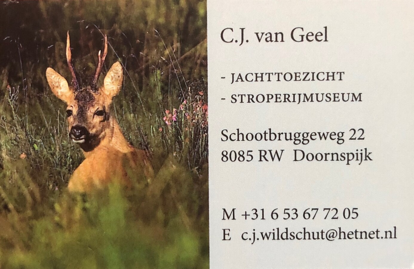 Cees was bijna zijn hele leven jachtopzichter, hij verhaalde er over in zijn boek “Jachttoezicht en stroperijbestrijding”, inmiddels uitverkocht, eerst in Noord-Holland, toen in het Rivierengebied, daarna bijna een mensenleven op “De Utrecht” in Brabant. Na zijn pensionering daar is hij nog een aantal jaren jachtopzichter op de Veluwe geweest en nu beheert hij het landgoed van de SBNL in Doornspijk, waar nu ook zijn museum een onderkomen gevonden heeft.