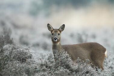 Ik zit nog een tijdje na te genieten, misschien, als de mist nog wegtrekt kan ik ze nog een keer spotten. Maar het blijkt vergeefse hoop. Ik zie ze niet meer en de mist, die lijkt van tijd tot tijd nog dikker te worden. Toch zie ik opeens weer witte vlekken in de mais. Vlak voor mij deze keer, dus op minder dan 50 meter. Reewild, even denk ik nog aan de terugkeer van het roodwild, maar nee, reewild, zeven stuks, dat is zeker.